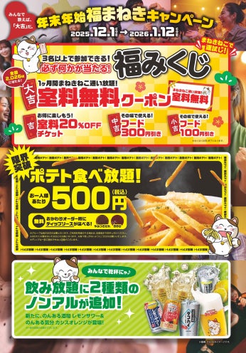 全国の「カラオケまねきねこ」では、2025年12月1日(月)から1月12日(月)まで、「年末年始福まねきキャンペーン」を実施します。3名以上でお越しいただいたゲストの皆様が実施できる「福みくじ」は、カラオケまねきねこの室料が無料になるクーポンが2026組に当たるなど豪華賞品を用意しています。大吉を願って、まねきねこで運試しをしてみて下さい。