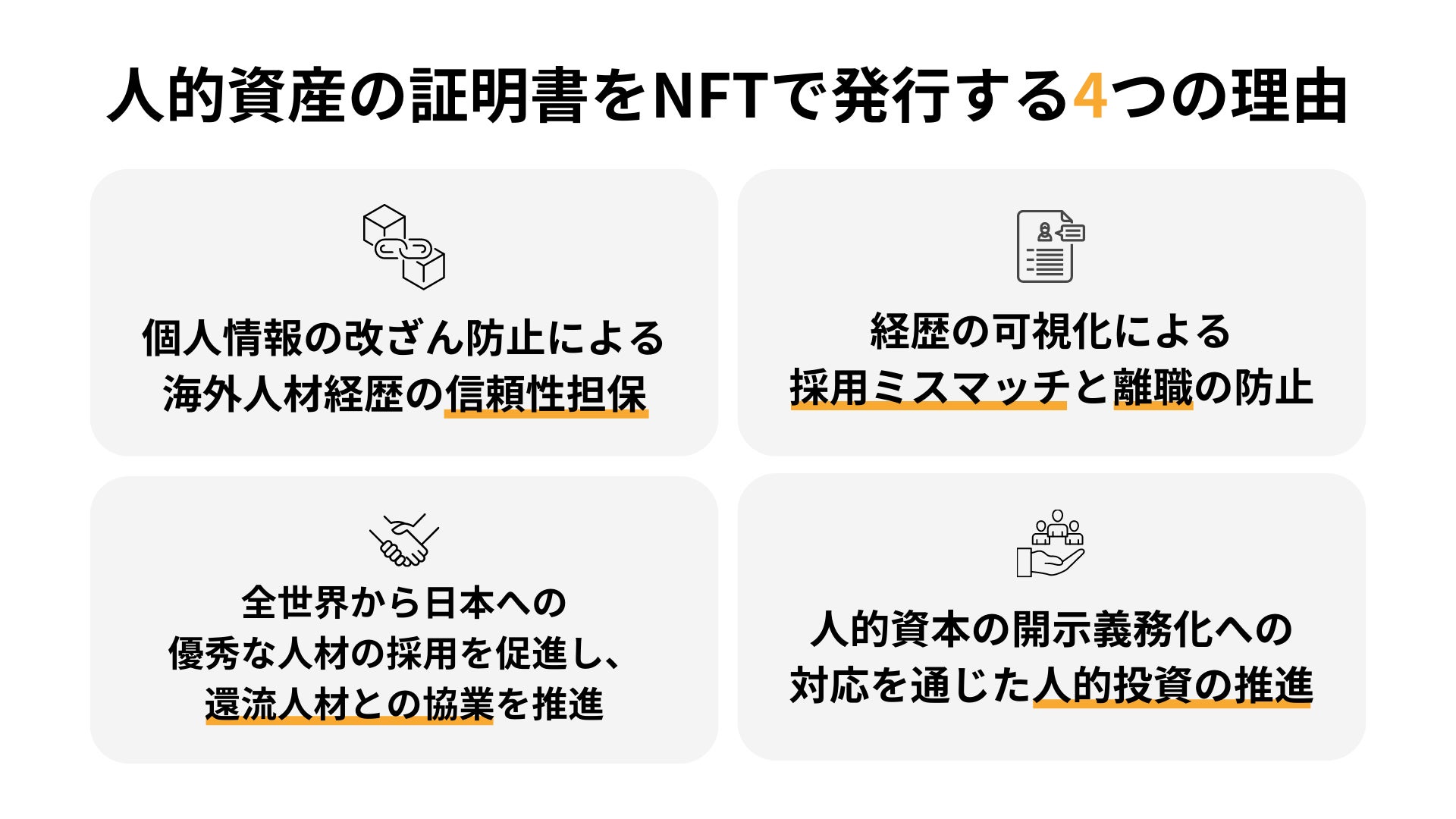 こうした課題に対応し、従来の履歴書・職務経歴書だけでは可視化が困難であった人的資本情報をNFT化していくことで、学びと仕事が一体となった人材資本の形成と最大化に貢献します。