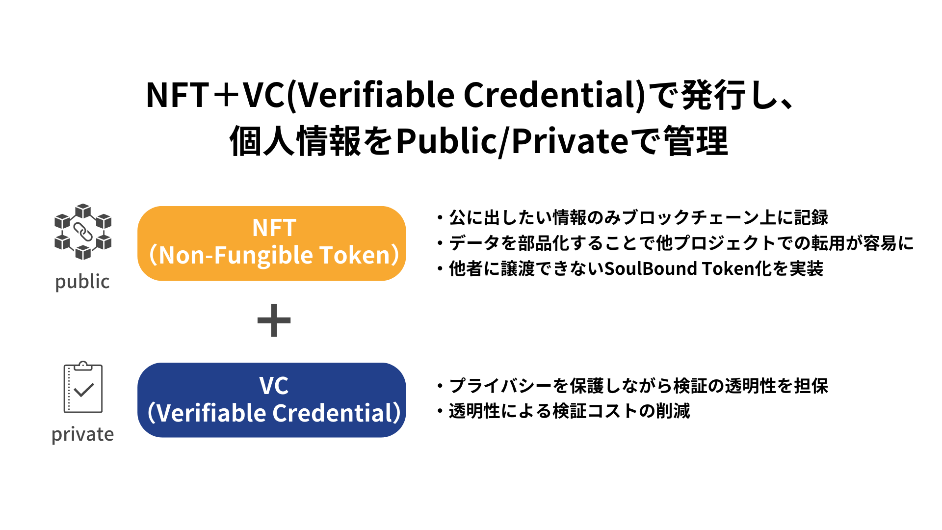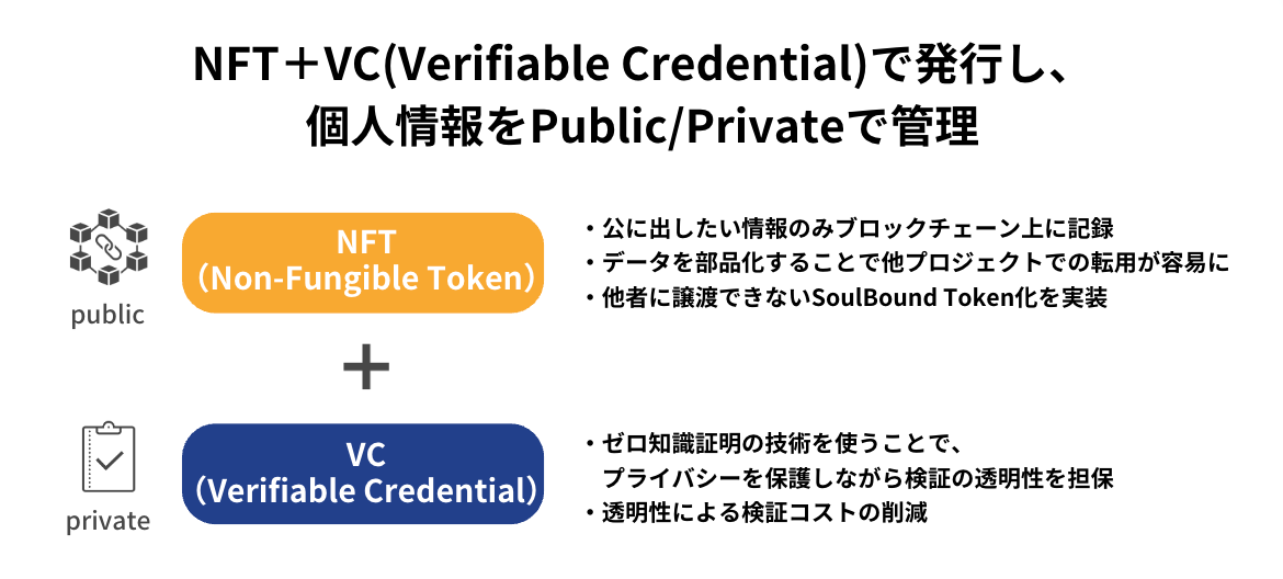 昨今、学歴や職歴などの個人情報のトークン化について議論される際に、「ブロックチェーン上に個人情報を記録することに抵抗がある」という意見を往々にして見受けられますが、このVCとNFTの2つの技術を活用することでこの課題に対応します。