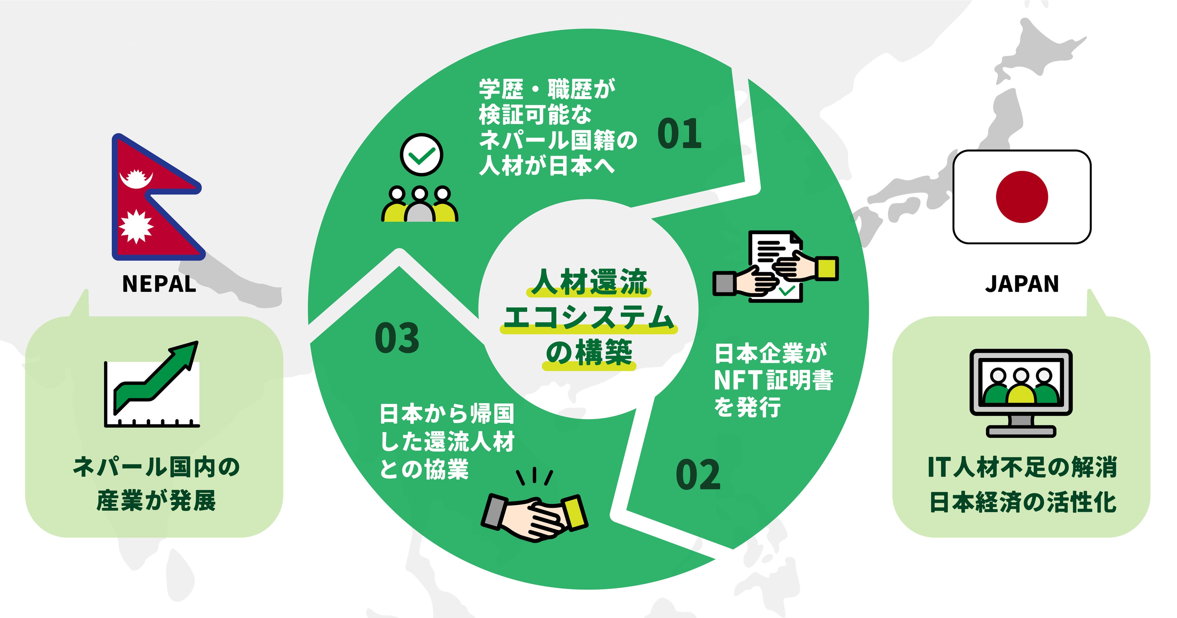 そこで本プロジェクトでは、NFTを活用した日本独自のキャリア開発環境を整備することで日本企業での就業インセンティブを高め、海外の高度人材の活躍を促すと共に、日本から帰国した還流人材との協業機会を創出するなど、あらゆる人材が活躍できるエコシステムの構築を目指します。