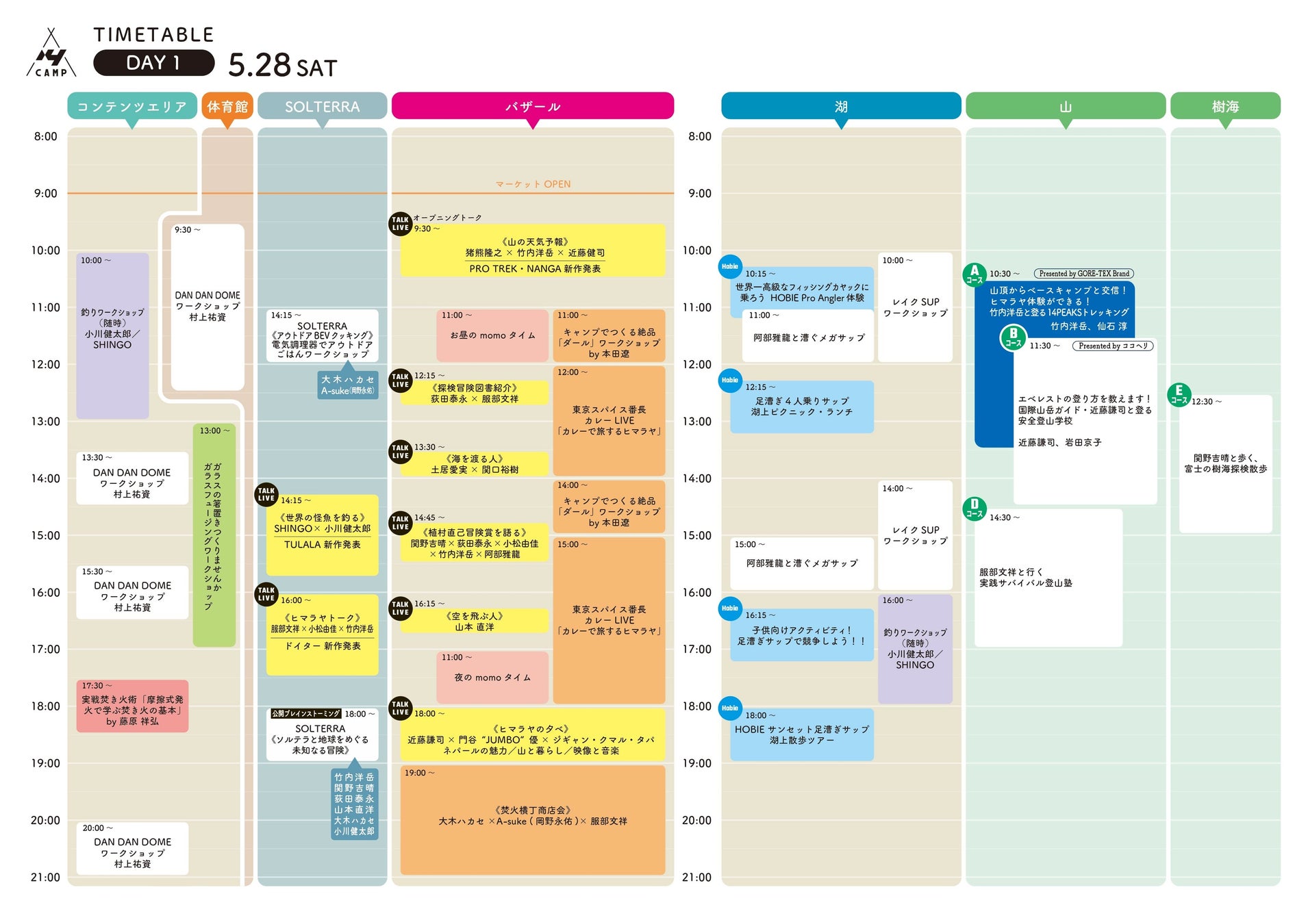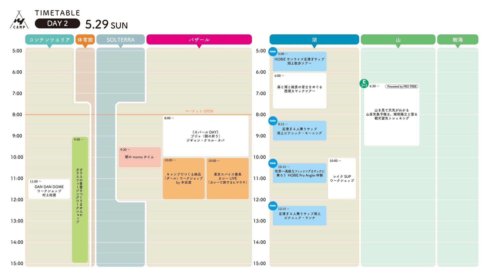 その他、全体のタイムテーブルを発表。山や湖、樹海でアウトドアの第一人者たちと地球遊びを楽しめるコンテンツのほかに、バザールエリアで提供されるネパール料理や雑貨、アウトドア用品の販売などさまざまな情報をキャッチいただけます。