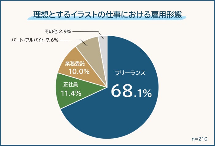 理想とするイラストの仕事における雇用形態を聞いたところ、「フリーランス」と答えた人が圧倒的に多く、68.1%となっています。勤務場所や作業時間の自由度を重視する人が多いことから、「フリーランス」という結論に至ったのでしょう。