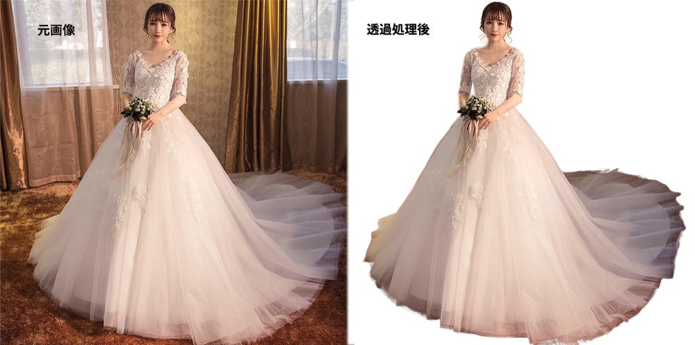 ウェディングドレスや水滴など、素材や形状が異なるPNG画像にも高精度で対応できることは、多様なニーズに応えるツールの証。 |