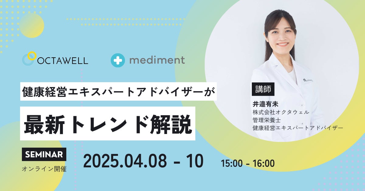 株式会社オクタウェル(本社:東京都渋谷区、代表取締役:高木鈴子)とメディフォン株式会社(本社:東京都港区、代表取締役CEO:澤田 真弓)は、健康経営に関するオンラインセミナー「健康経営エキスパートアドバイザーが解説!健康経営優良法人2025の成功事例と取組のトレンド」を共同で開催いたします。