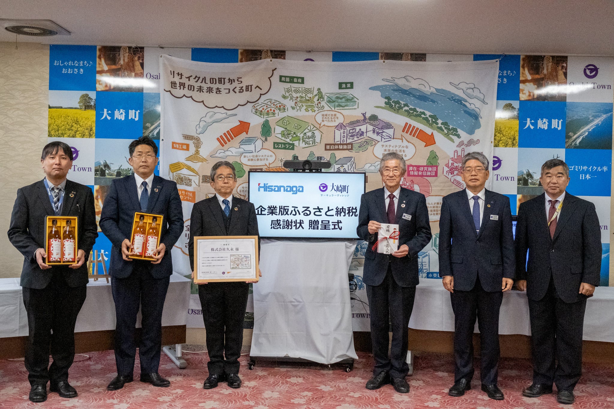 株式会社久永様より昨年度に引き続き、企業版ふるさと納税の寄附先として大崎町を選定いただいたことに対しまして心から感謝申し上げます。御社の「地域に根差し、地域と社員が共に成長し、常に地域に貢献する企業を目指す。」という経営理念は私たち自治体の運営についても共感できることが多く、今後も御社の取り組みを学ばせていただきながら、持続可能な地域づくりに努めてまいります。すでにご承知のとおり、本町では少子高齢化の進行、人口減少、新型コロナウイルスによる地域経済の低迷など様々な課題を抱えており、そのような多様な課題を行政のみでは解決できない現状があることから昨年、一般社団法人SDGs推進協議会を設立しました。これからも『リサイクルの町から世界の未来をつくる町へ』をスローガンにいただいたご寄附を活用し、より一層取り組みを加速させてまいりたいと考えておりますので、引き続き御支援・御協力をよろしくお願い申し上げます。