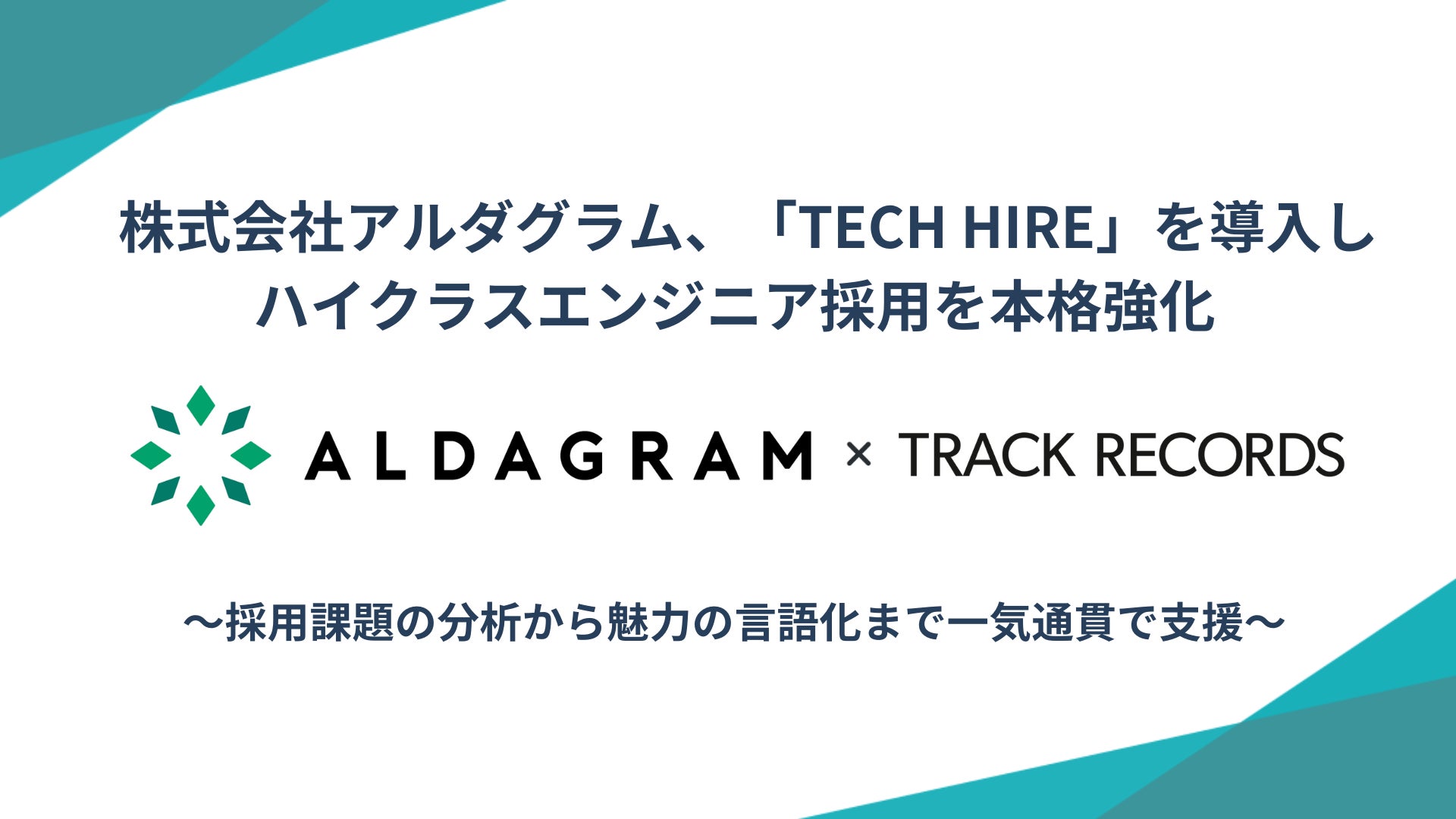 エンジニアを中心としたデジタル人材採用の総合支援サービス「TECH HIRE」を提供する株式会社トラックレコード(本社:東京都渋谷区、代表取締役:芹川 太郎、野崎 耕司)は、株式会社アルダグラム(本社:東京都港区、代表取締役社長:長濱 光)において、「TECH HIRE」が導入されたことをお知らせいたします。