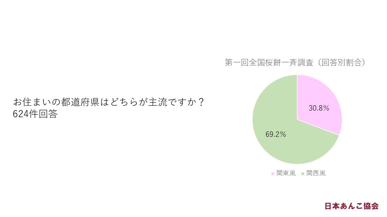 当調査では、全国1万名を超える日本あんこ協会の協会員「あんバサダー」に向け、任意にメールフォームによる一斉調査を実施し、調査期間中に624名からの回答が得られました。設問項目は3つで至ってシンプルです。1つめの設問では、回答者の居住地の都道府県名を求めました。2つめの設問では、回答者の居住地では関東風と関西風のどちらが主流か回答を求めました。3つめの設問では、自由記述式で桜餅へひと言(愛の告白・ご意見・ご感想)を求めました。なお、調査期間は2024年2月19日から2月29日でした。