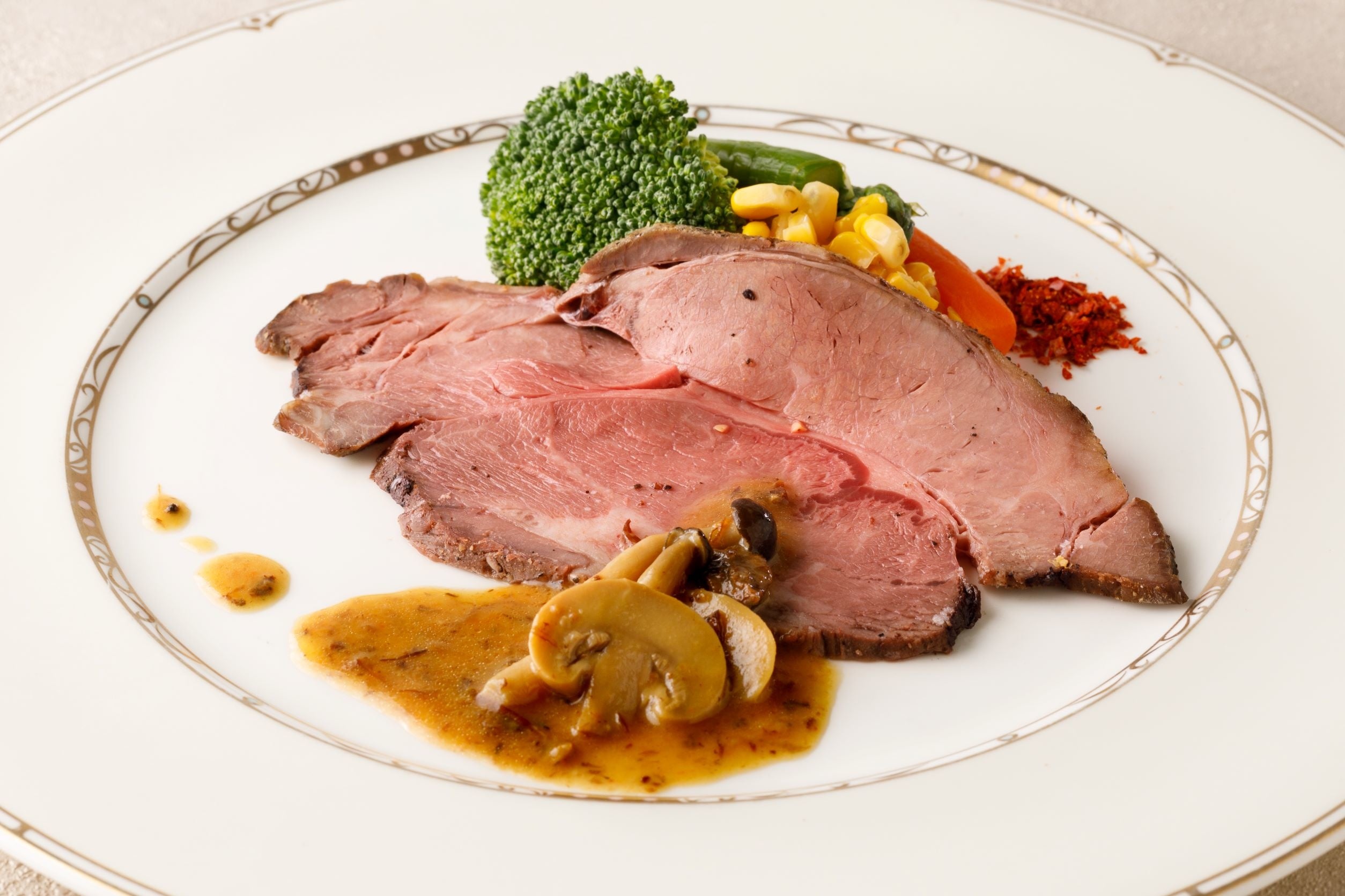 メニュー:サラダ、黒毛和牛ステーキ ロース(120g)焼き野菜添え、ご飯・味噌椀・香の物、シャーベット、