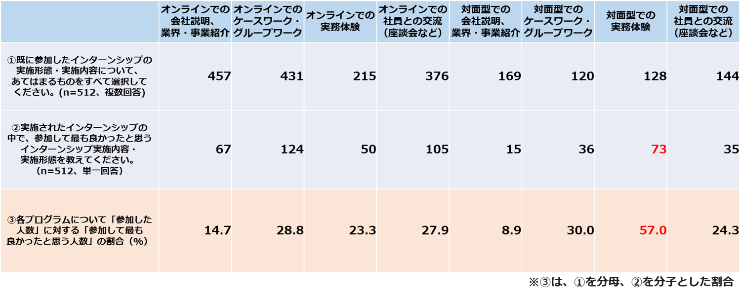 (2)最も参加して良かったインターンシップは「対面型での実務体験」