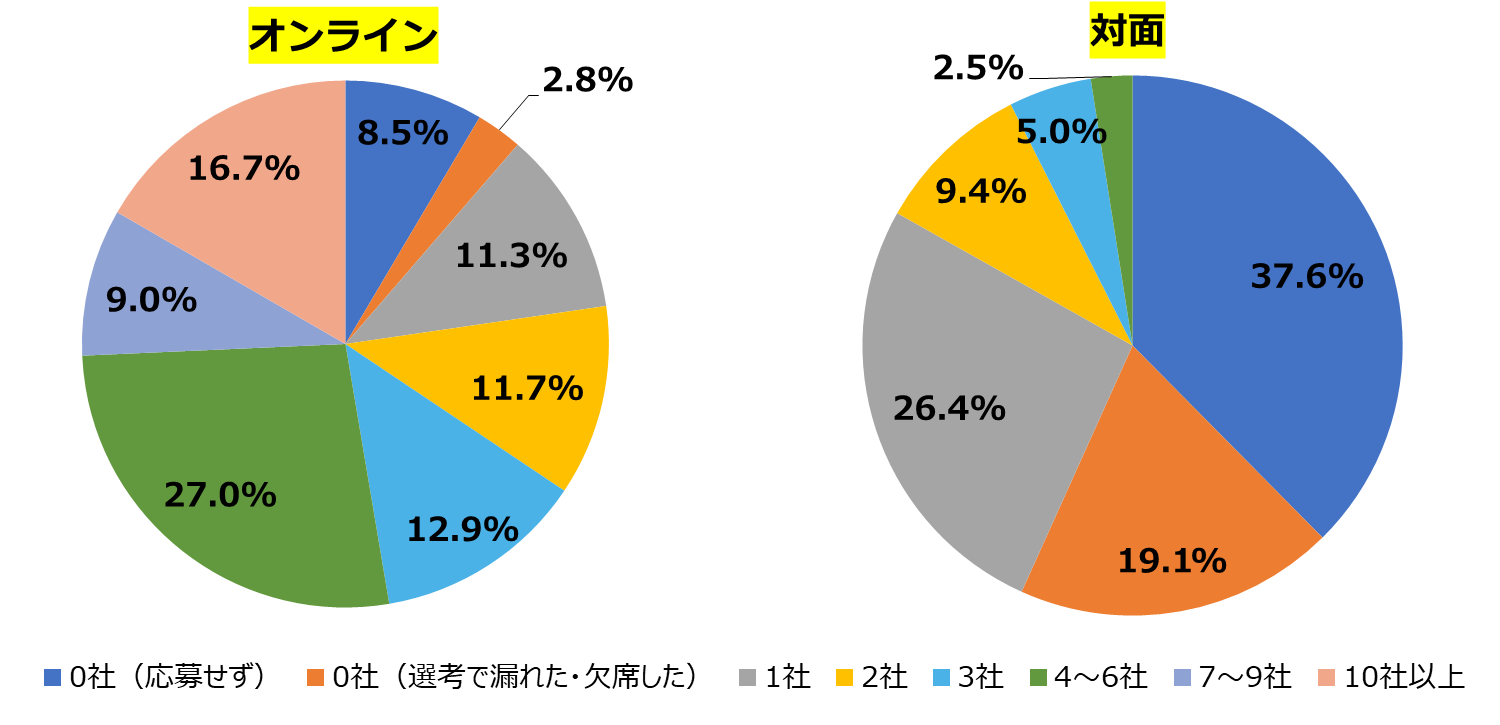 オンラインでは「4社以上」のインターンシップに参加した学生が半数以上、対面でのインターンシップ参加は「0社」と「1社」で8割を超えており、オンラインでのインターンシップ参加率が非常に高かったことがわかる。また、対面では「0社(選考で漏れた・欠席した)」の割合も約2割となり、対面インターンシップは人数制限等により選考が厳しかったことがうかがえる。