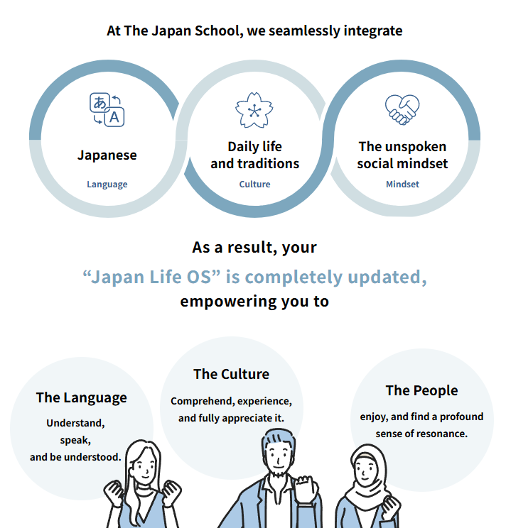実践的な日本語(Language)、 日本の文化や社会ルール(Culture)、 そして日本人の思考様式(Mindset)。この3つを切り離さずに学ぶことで、 日本社会で生きるための“OS”をインストールする。