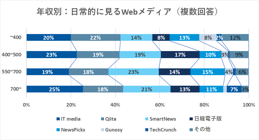 年収が高い方は「IT media」や「Tech Crunch Japan」などの最新の業界情報を提供するメディアの利用割合が、他の年収層より多くなっています。年収が上がれば、組織や事業の意思決定に関わる人の割合も増えます。そのため、日常から業界や競合に関する情報を仕入れておく必要があるものと考えられます。
