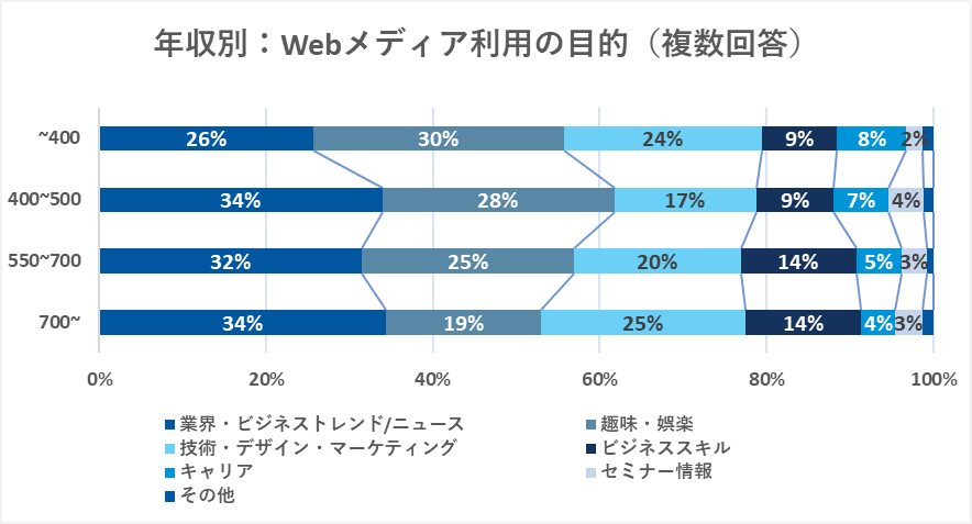 年収が上がるほど、「趣味・娯楽」の情報に触れることは少なくなっています。その代わりに、「業界・ビジネストレンド/ニュース」「技術・デザイン・マーケティング」「ビジネススキル」等の仕事に直結する情報を入手している割合が、他の年収層よりも最も多い結果となりました。