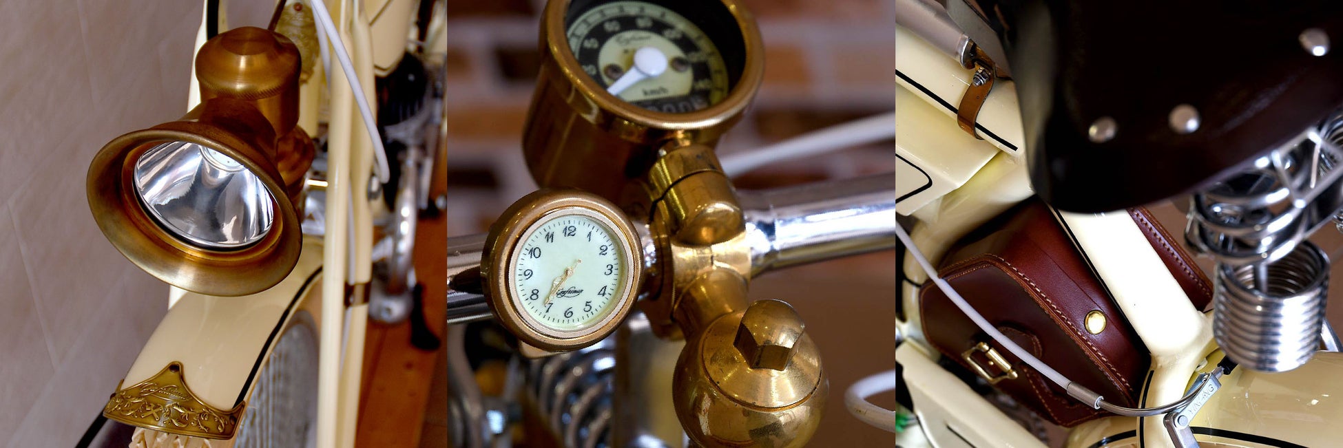レトロな雰囲気を醸し出すクリーム色を基調としたボディにアンティーク調のメーターやライト、空気入れを搭載。シート下には革の工具入れが標準装備されています。
