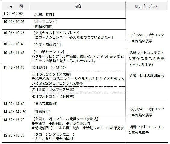全国各地のこどもエコクラブが集い、環境活動の紹介を通じて相互の交流を深めるとともに、これらの情報を広く発信することにより、こどもエコクラブの活動の活性化及び本事業への理解と参加促進を図る。