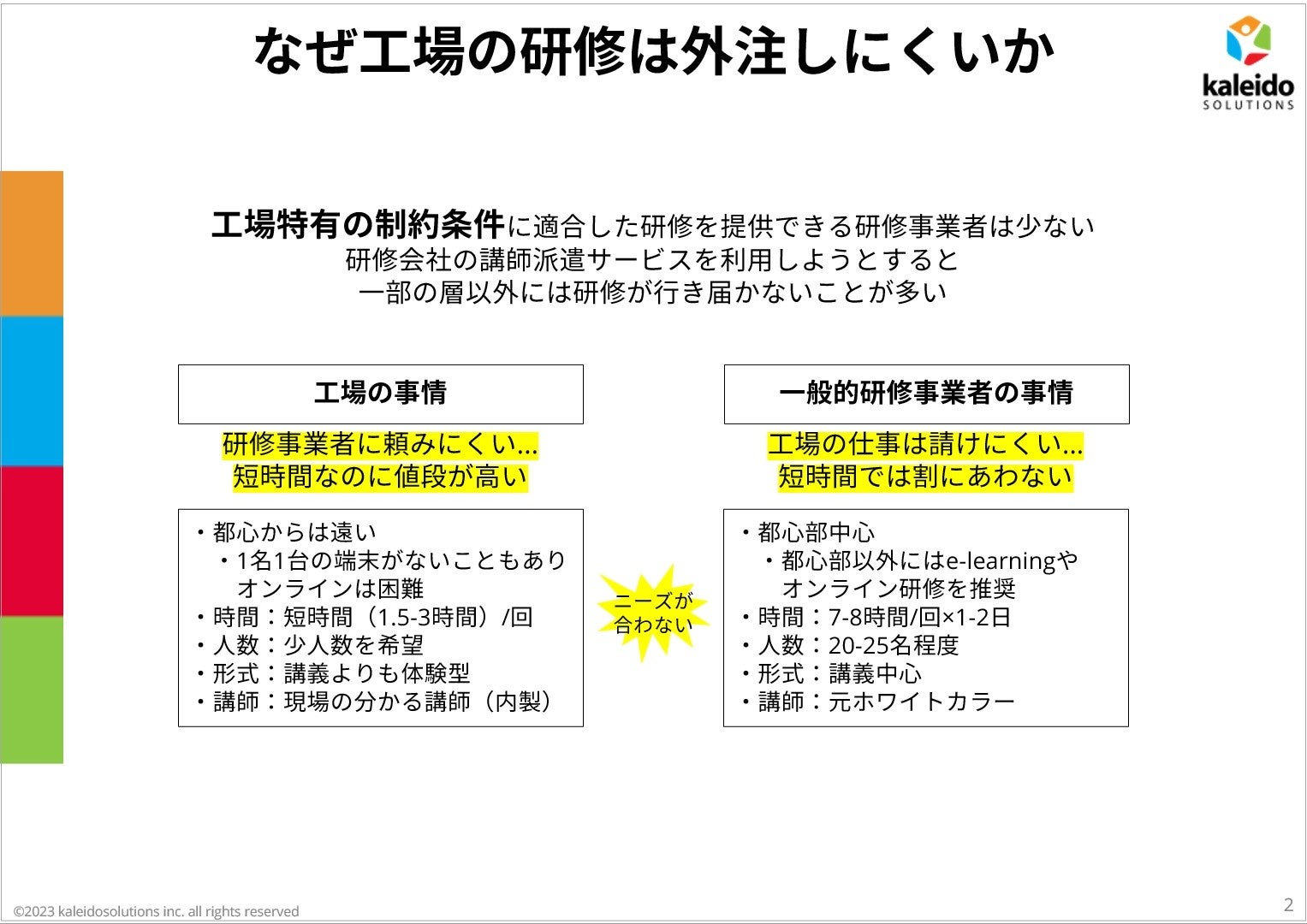 また、研修会社も、工場が遠方にある、デバイスが与えられておらずオンライン研修が難しい、担当者が人材開発部門ではなく研修の導入経験が少ない、研修内容を工場向けに変更しなければならない、工場就業者のイメージがわかないといった特有の事情から、対処が難しいものでした。