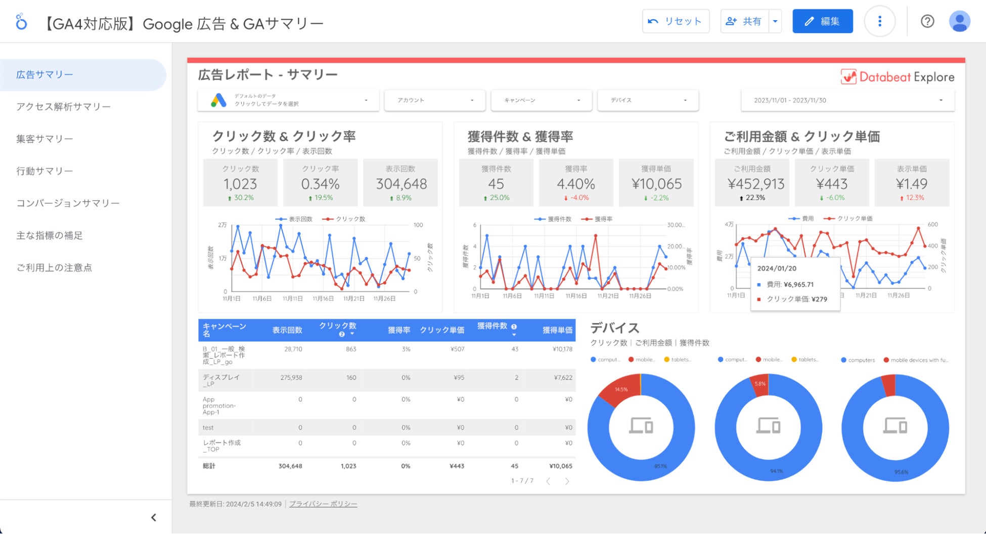 テンプレートは全5ページの構成で、ページタブをクリックするだけで簡単にGoogle広告のサマリーやGA4のデータを切り替えて閲覧できます。