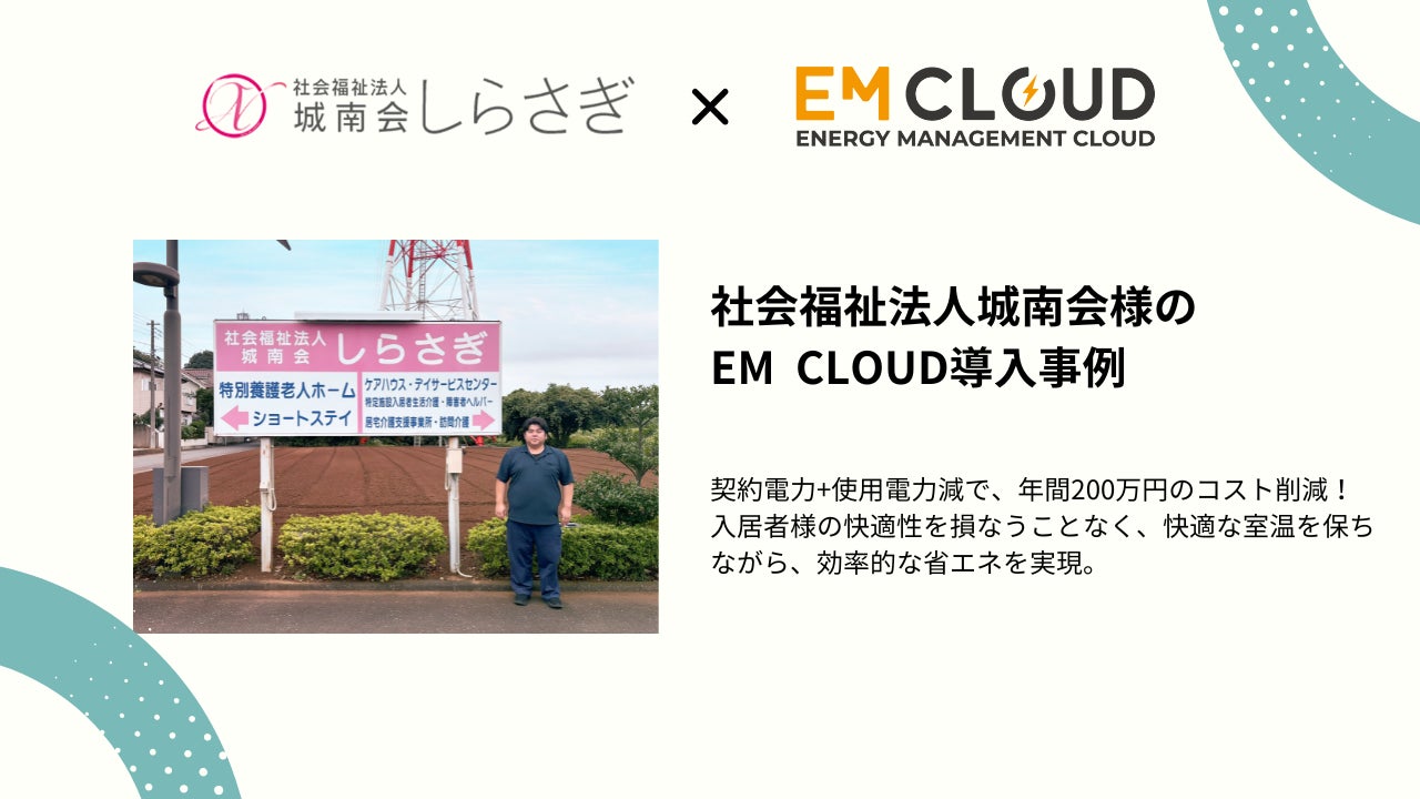 エネルギーマネジメントシステム「EM CLOUD」を提供する株式会社ムダカラ(本社:東京都港区、代表取締役:田﨑太郎、以下、当社)は、社会福祉法人城南会(埼玉県さいたま市、理事長:大澤 孝至、以下、城南会)に提供した「EM CLOUD」の導入事例インタビューを公開しました。特別養護老人ホームを運営している同社は、年々上昇する電力コストへの対応と施設の省エネ化の課題解決のため、空調の自動制御と電力の見える化が可能な「EM CLOUD」を導入。年間200万円のコスト削減に成功し、入居者様の快適性を損なうことなく省エネを実現しています。