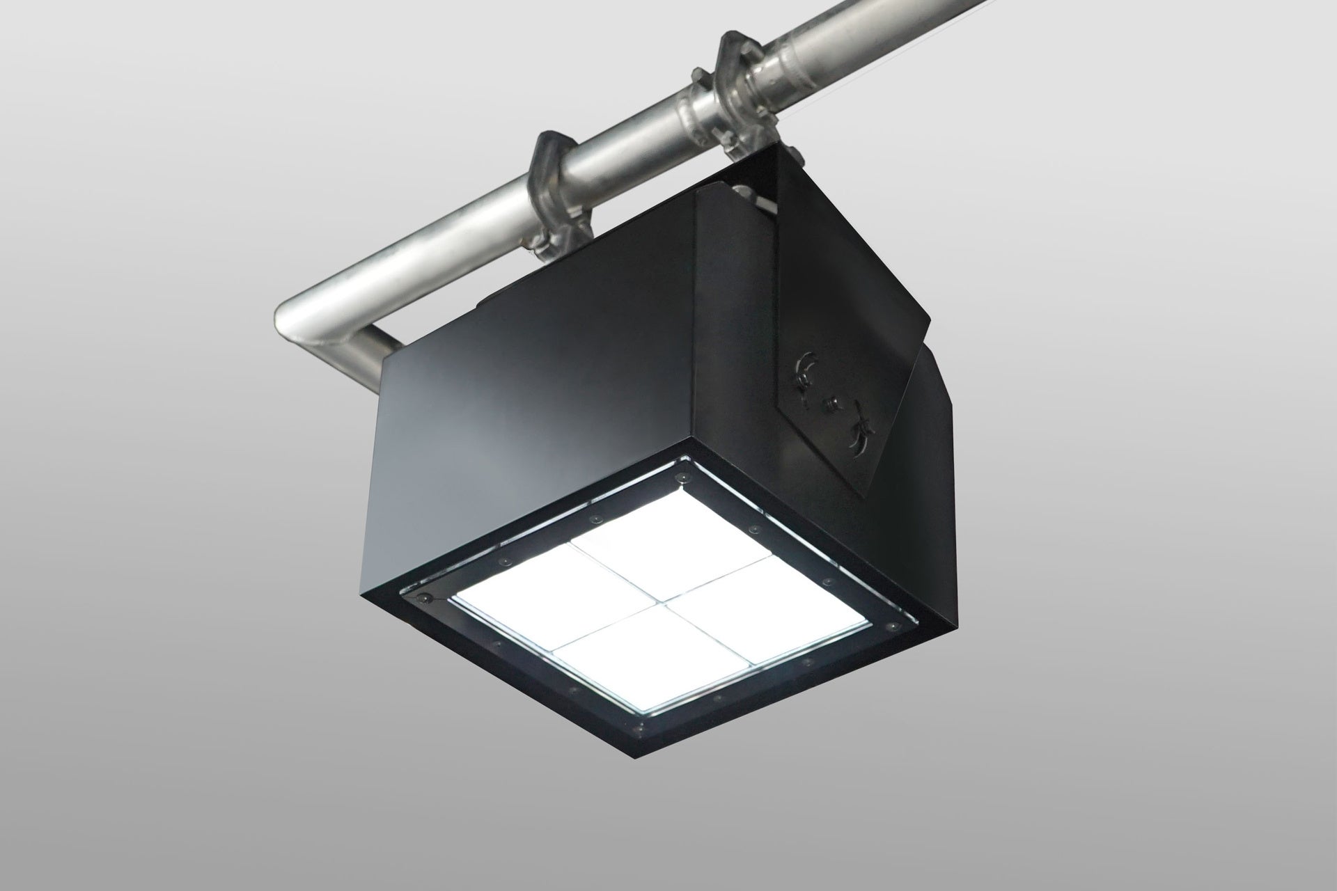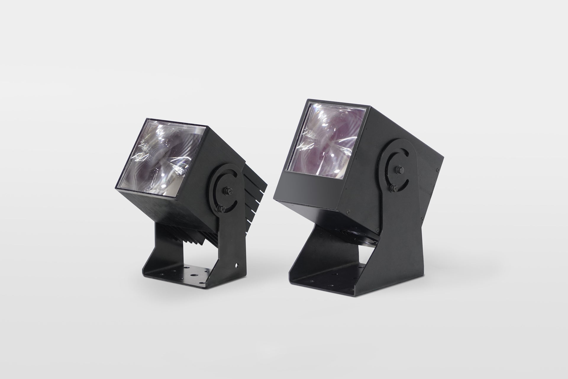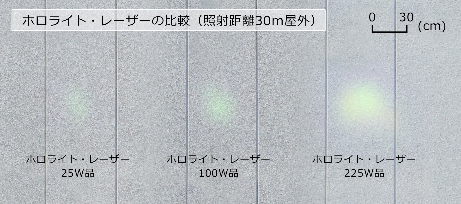 白色レーザー照明モジュールを並列接続した「ホロライト・レーザー屋外用100W品」、「ホロライト・レーザー屋外用225W品」は「ホロライト・レーザー25W品」と比較して、それぞれ約4倍(照射距離20m時に4.5万ルクス)、約9倍(照射距離20m時に10万ルクス)の照度が得られ、直射日光下でも十分な視認性が得られます。