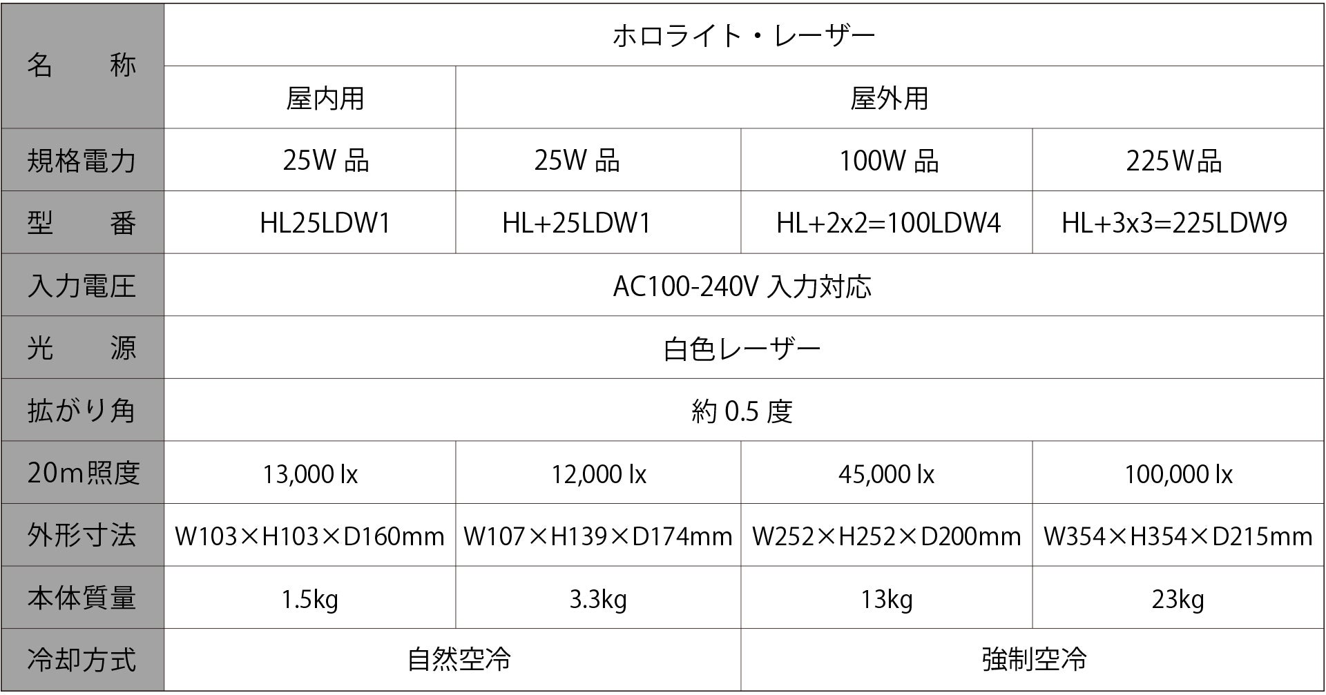 超高指向性レーザー照明「ホロライト・レーザー」は、屋外の直射日光下でも視認性の高い点状の光を遠方に形成する白色レーザー照明です。本製品は、「ホロライト・レーザー屋内用25W品」、「ホロライト・レーザー屋外用25W品」、「ホロライト・レーザー屋外用100W品」、「ホロライト・レーザー屋外用225W品」の4種類、いずれも照明色は白色のみとなります。高指向性LED照明「ホロライト15W品」と比較して、遠方で25W品は約4倍、100W品は約16倍、225W品は約36倍の照度を実現しています。25W品は照射距離10m時に約5万ルクス、100W品は照射距離20m時に4.5万ルクス、225W品は照射距離30m時に4.5万ルクスとなり、直射日光時の照度約10万ルクスにおいても十分な視認性が得られます。