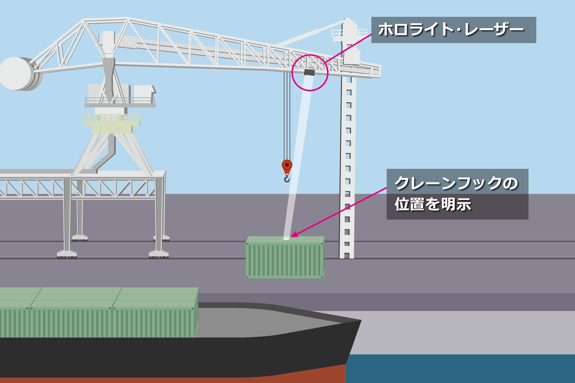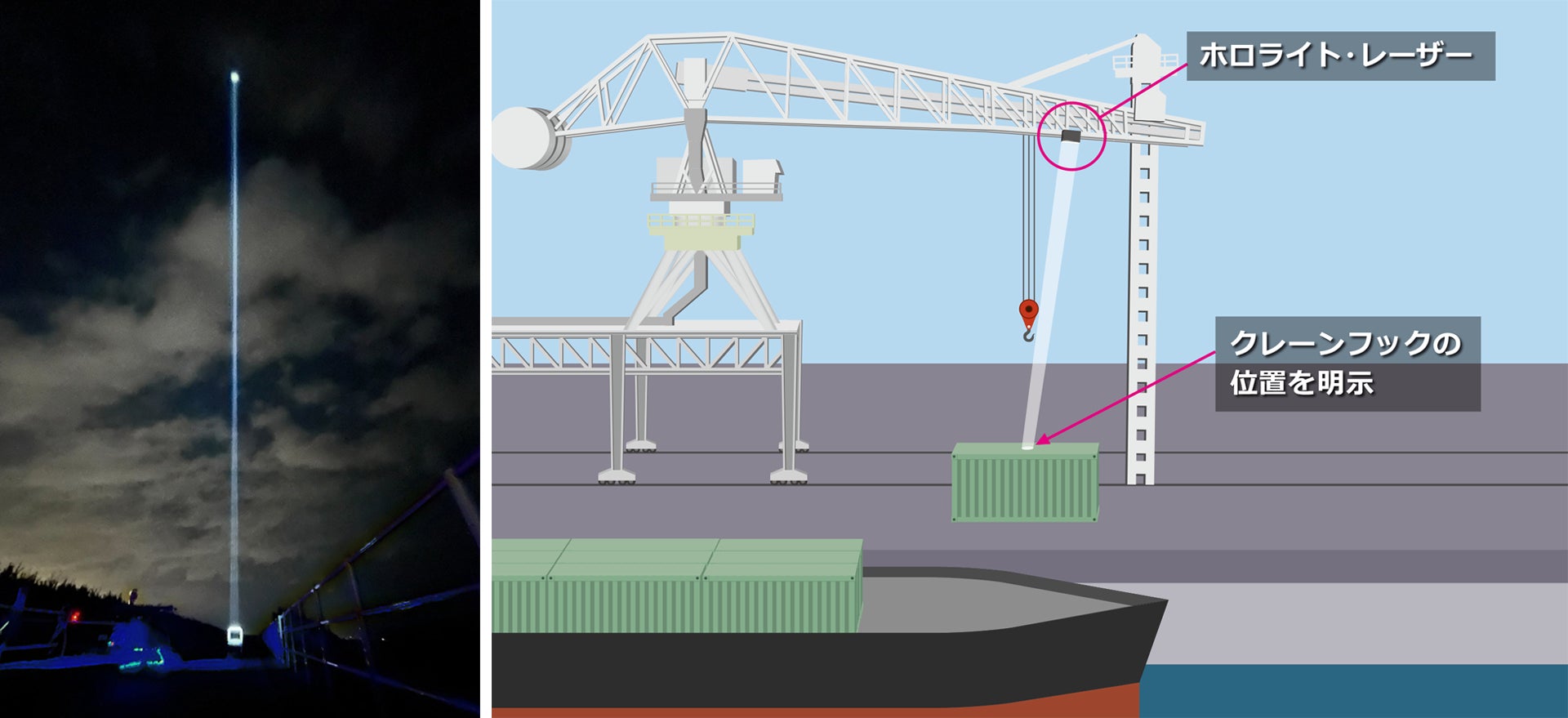 従来品である「ホロライト15W品」と比較して、約4倍の明るさの光を照射し、日中の屋外においても視認が可能です。このため、埠頭や建設現場等の屋外で使用されるクレーン等に設置して、直射日光下の環境でフックや荷下ろしの位置を明示する位置決め作業支援用途を想定しています。本製品を並列接続したシリーズ品「ホロライト・レーザー屋外用100W品」、「ホロライト・レーザー屋外用225W品」は、レーザー照明モジュールの接続数を増加することで、さらに明るい光を照射する装置を専用設計した製品です。これによりサーチライトのように空中に光線を形成する用途でもご使用いただけます。