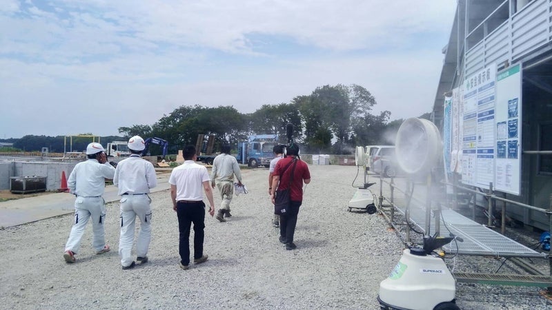 ミスト扇風機は現場内にも設置しています。冷房完備の仮設トイレ完備の作業所もあります。