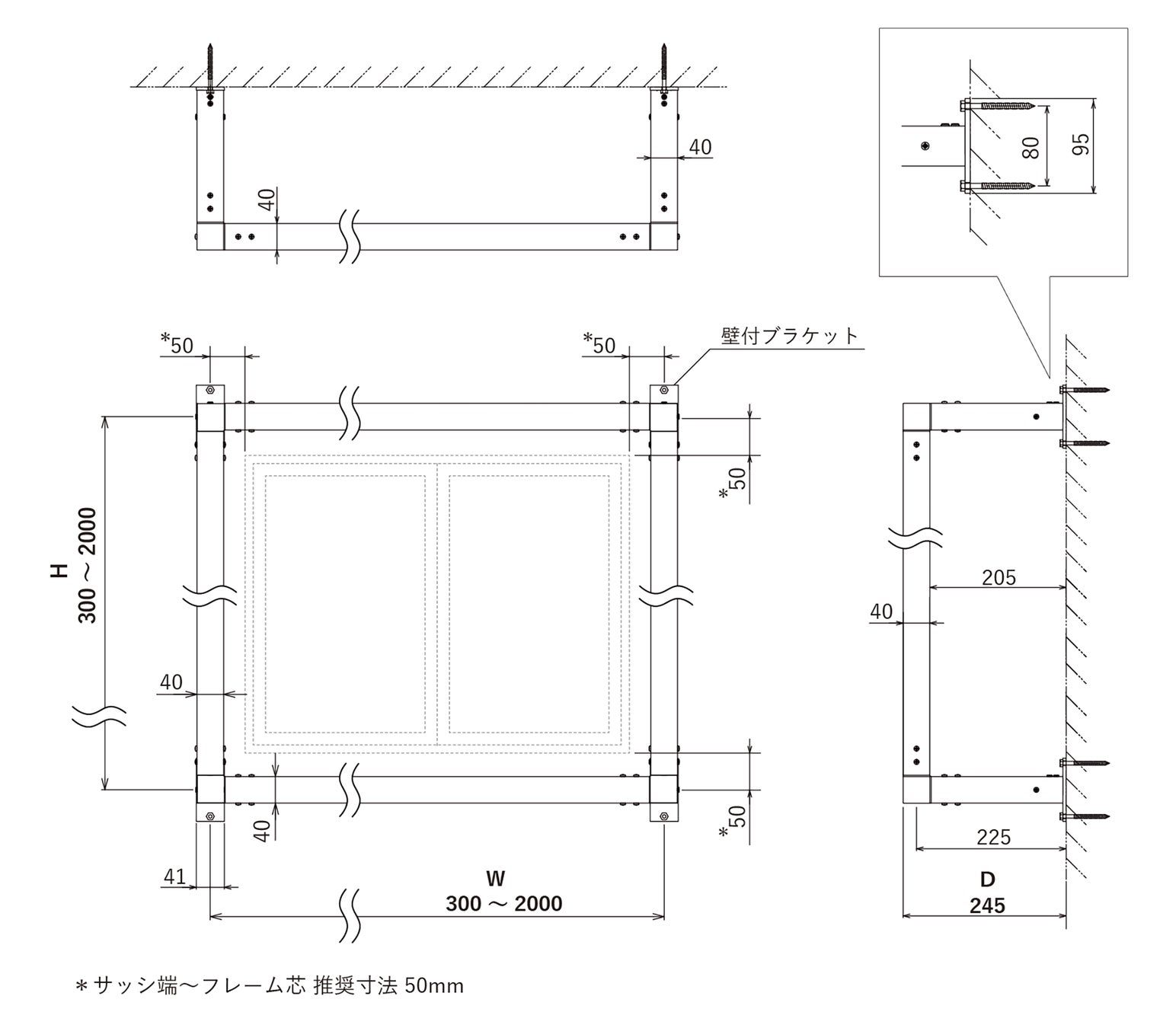フレーム:アルミニウム コーナーブラケット:アルミダイカスト 壁付ブラケット:SUS |