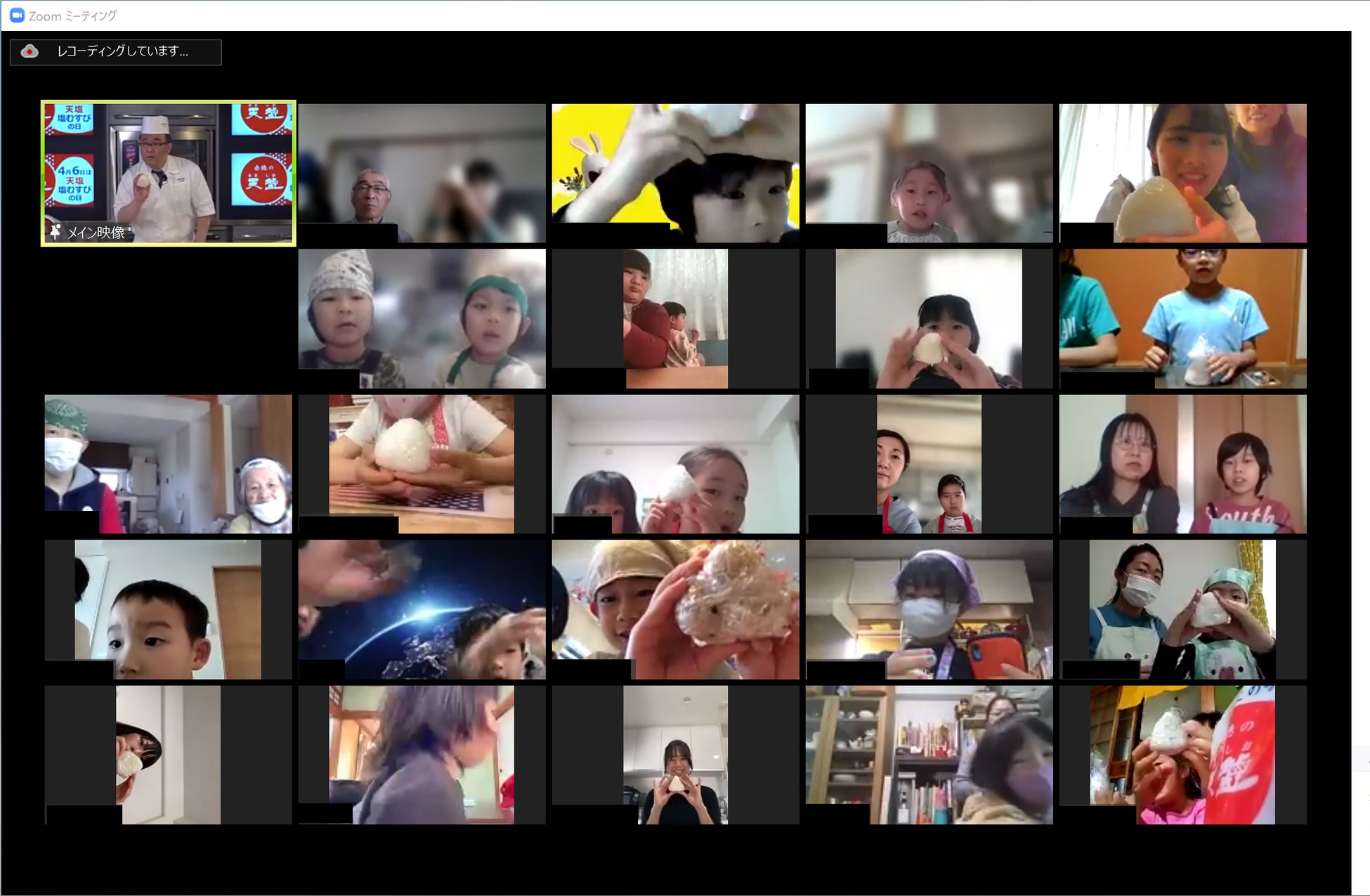 画面を見ながらのおむすびの作りでしたが、「上手にはじめて三角に作れた!」「手にご飯がいっぱいついた!」など、子どもたちは楽しみながら学んでいきました。一枚田先生の「上手に出来た人!」の呼びかけを合図に、美味しそうな塩むすびが画面にたくさん映りました。完成した塩むすびを、参加者みんなで一緒にいただきます。その後、一枚田先生による、塩むすびと一緒に食べたいお料理3品を紹介しました。普段見ることができないプロの技にお子様よりも一緒に参加してくださったお母様達から「すごい!キレイ!」などの声が聞こえていました。