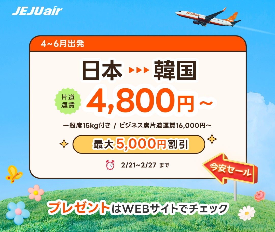 チェジュ航空(代表取締役社長、キム・イベ)が2月21日午前10時から27日午後5時までの1週間、チェジュ航空会員を対象に航空券を割引販売する「今安セール」を実施する。