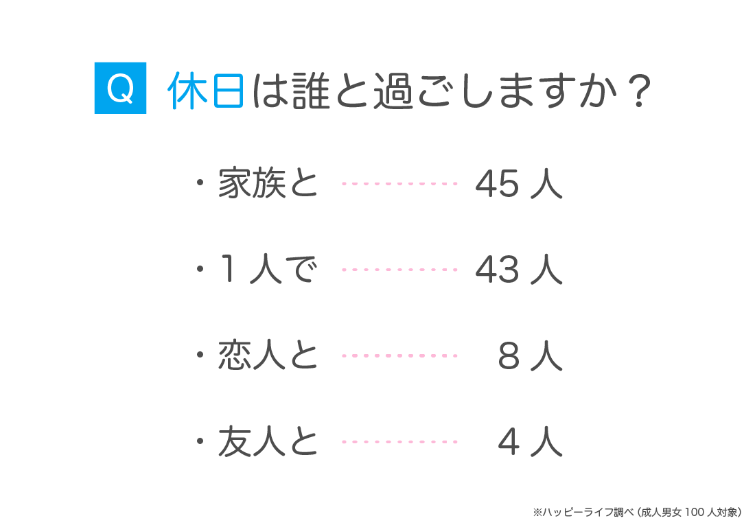 恋人や友人と過ごす人は少数派で、ほとんどの人が家族または1人で休日を過ごしているようです。