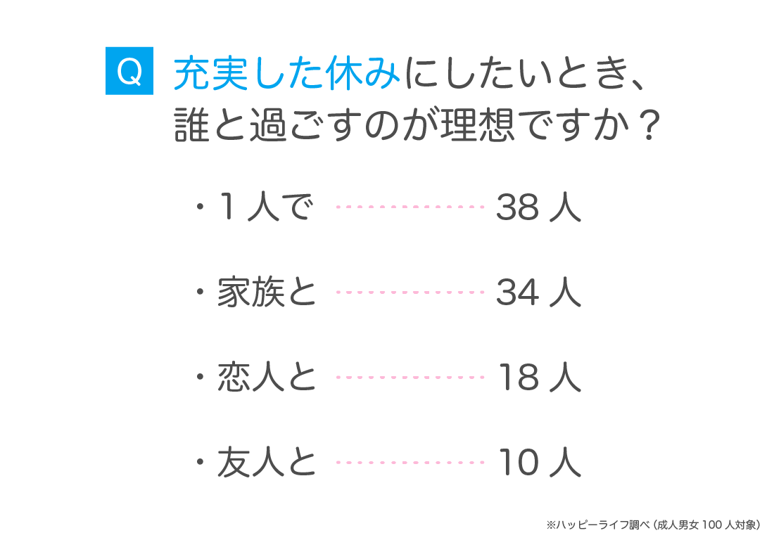『充実した休みにしたいとき、誰と過ごすのが理想ですか?』という質問では、「1人で」と回答した人が約4割を占めて最多でした。