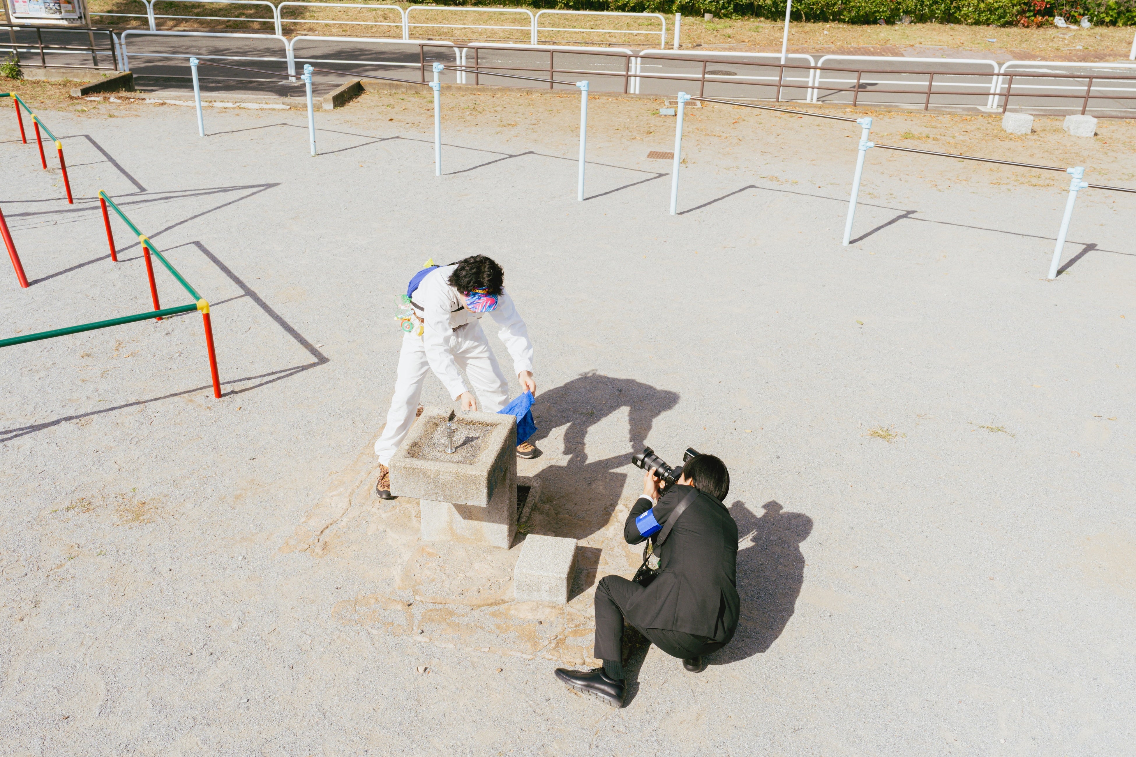 会場には、白いつなぎ姿のキャラクターに扮し、街中を駆け回るくるまを、加賀が追いかけながら撮影した作品群が並びます。さらに、写真家・武井宏員が捉えた二人の姿や、くるまを撮影する加賀の姿もあわせて展示。展示全体を通して、作品だけでなく二人の関係性までも楽しめる構成となっています。