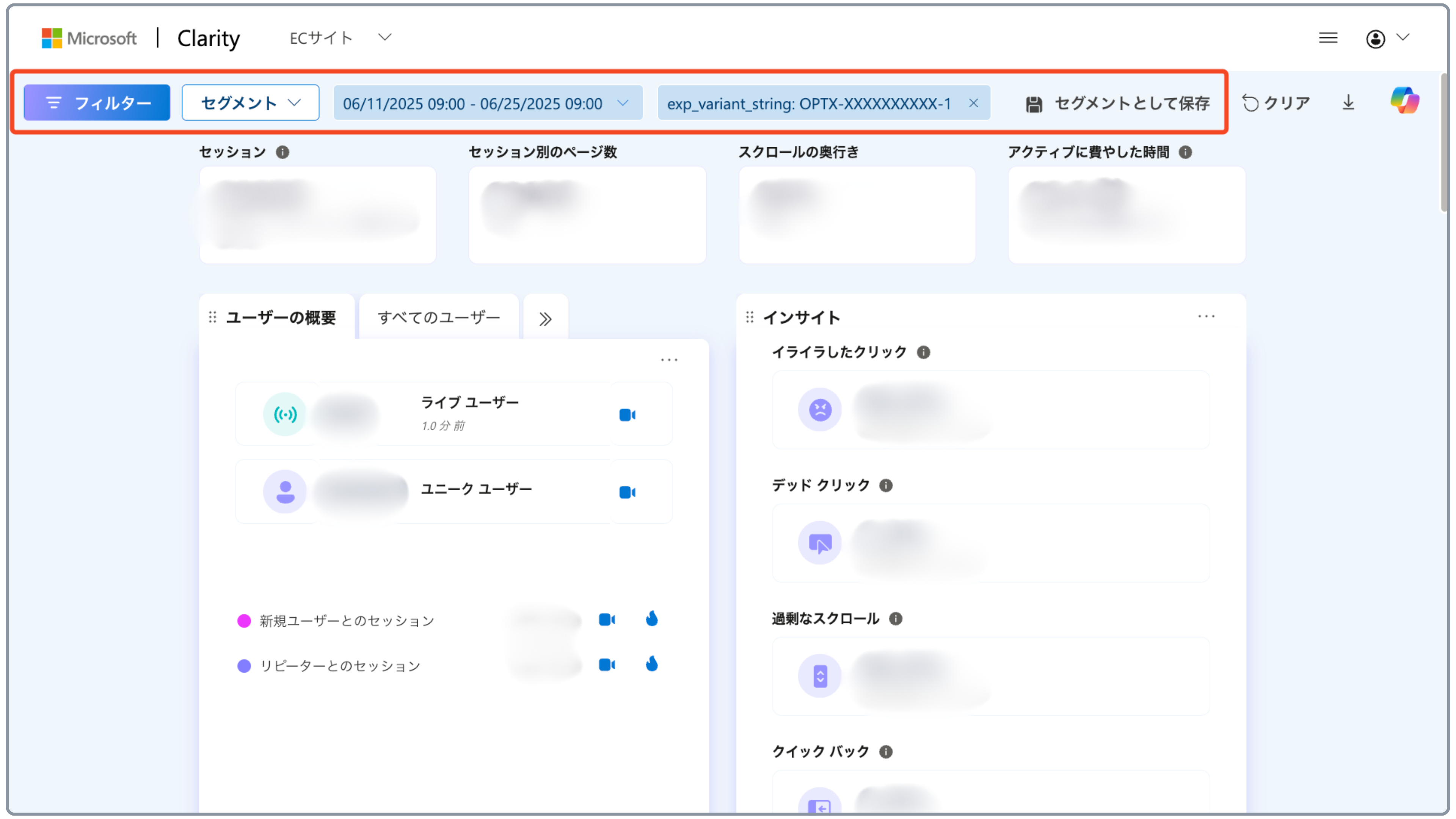 Optimize Next のレポート画面に表示されるリンクをクリックするだけで、「フィルターが適用された状態の Clarity ダッシュボード」へ直接遷移。手動で複雑なタグ設定やフィルター設定を行う必要はありません。