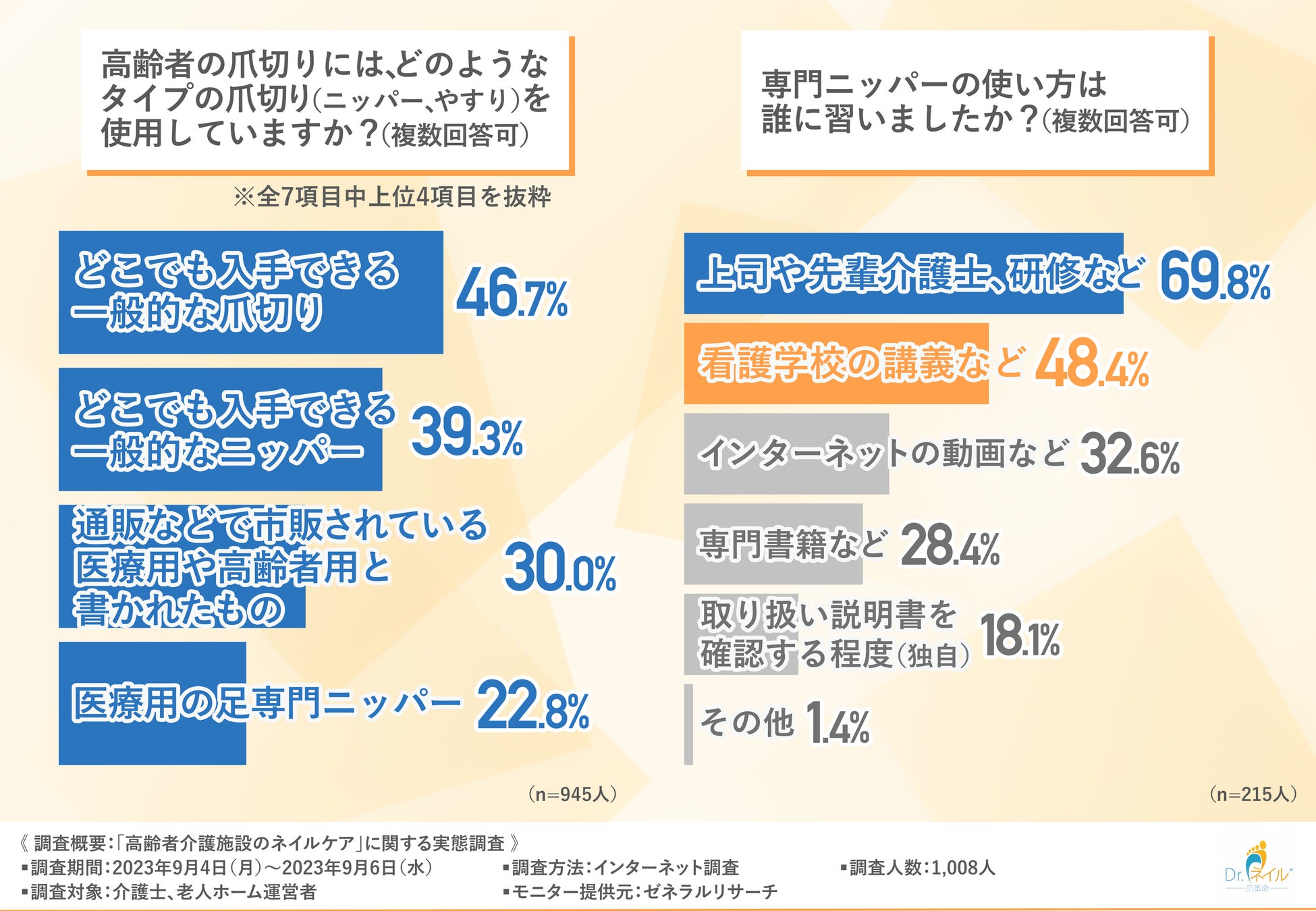 そこで今回、フットケア専門店『ドクターネイル爪革命®』を運営を行う在宅医療マッサージ株式会社(https://dr-nail.jp/)は、介護士と老人ホーム運営者を対象に、「高齢者介護施設のネイルケア」に関する実態調査を実施しました。