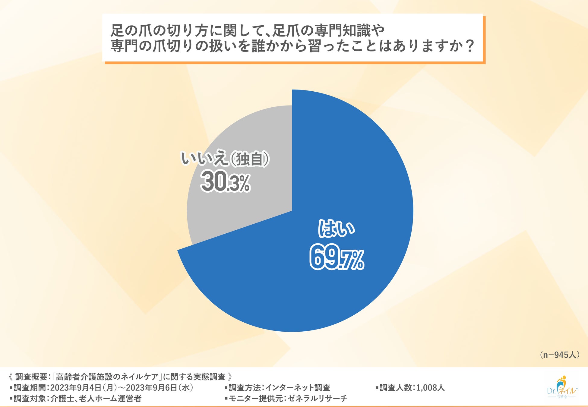 「足の爪の切り方に関して、足爪の専門知識や専門の爪切りの扱いを誰かから習ったことはありますか?」と質問したところ、およそ7割の方が『はい(69.7%)』と回答しました。