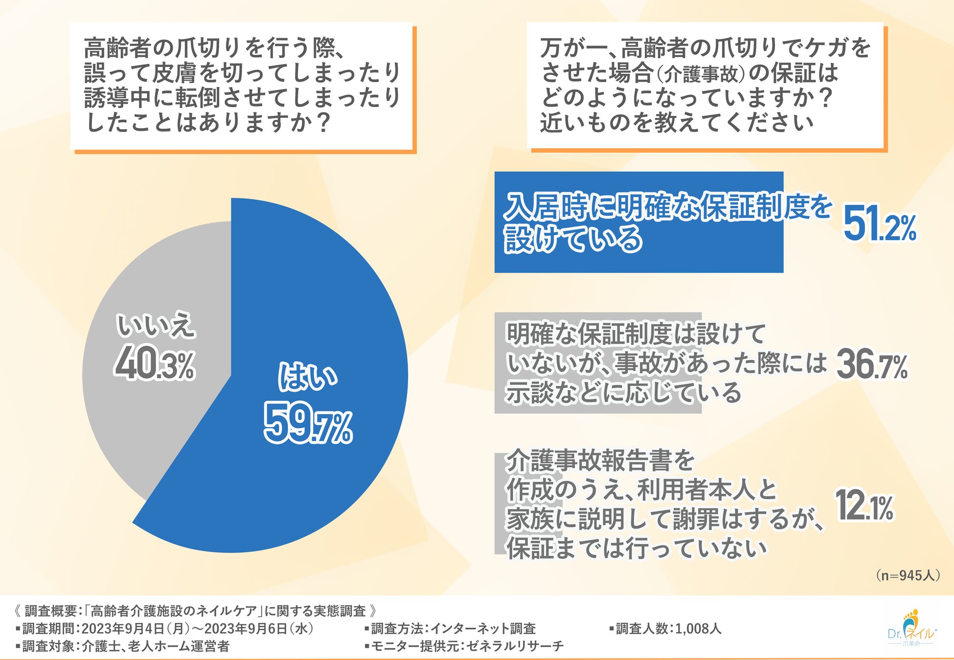 「高齢者の爪切りを行う際、誤って皮膚を切ってしまったり誘導中に転倒させてしまったりしたことはありますか?」と質問したところ、およそ6割の方が『はい(59.7%)』と回答しました。