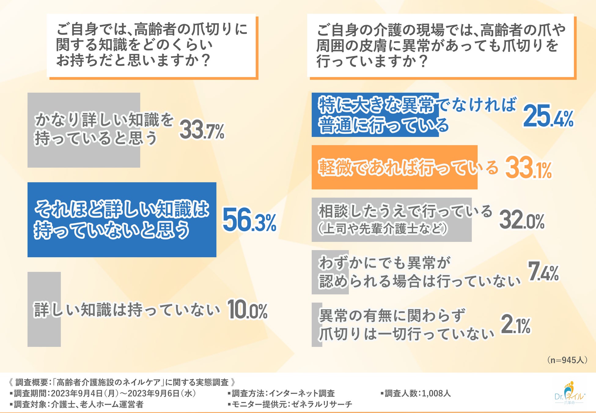 ほとんどの介護施設で、軽微であれば爪や皮膚に異常があっても爪切りを行っていることがわかり、爪切りに対する認識が不十分である介護士や経営者がいる可能性が高いことが浮き彫りになっています。
