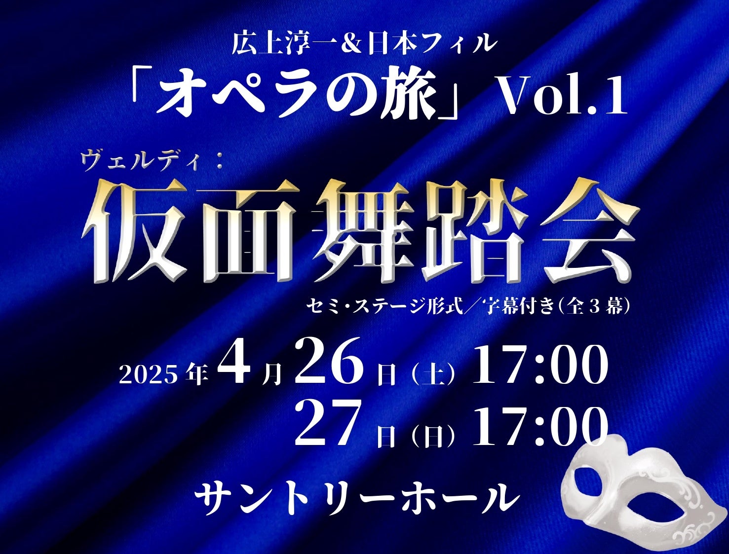 公益財団法人日本フィルハーモニー交響楽団(東京都杉並区、理事長:平井俊邦)は、2025年4月26日(土)、27日(日)東京・サントリーホールで<広上淳一&日本フィル「オペラの旅」Vol.1>ヴェルディ:オペラ《仮面舞踏会》を上演します。