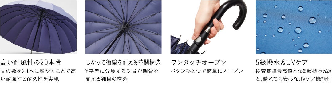 意匠・特許取得済みの特許構造である花びらき構造に加えて、骨の数を20本に増やすことで壊れにくい傘を実現。高い撥水性能はもちろんのこと、晴れの日でも使える紫外線カット加工付。