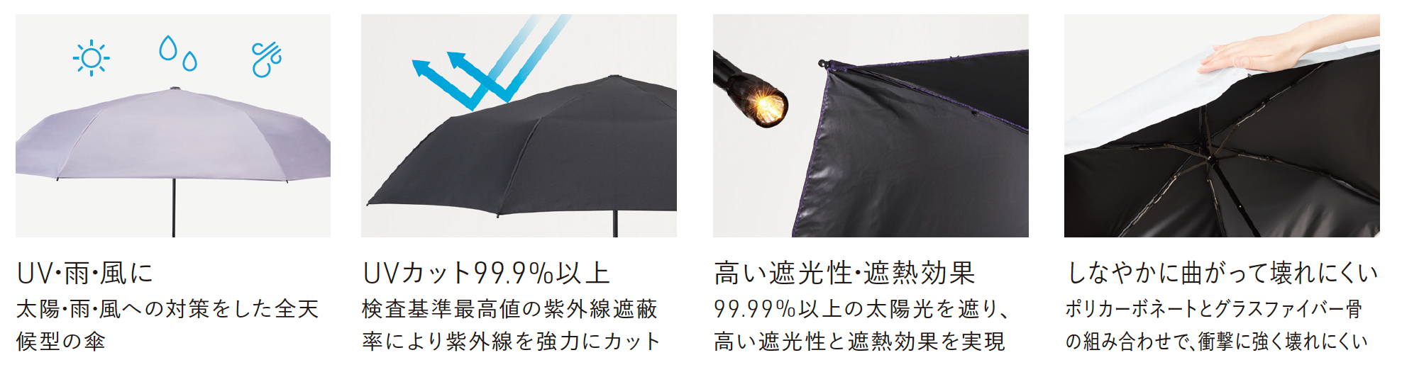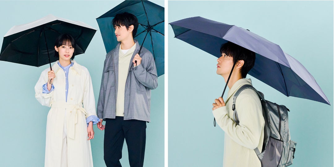 昨年も好評だった全天候型の傘を6色に増やし展開。内側のPUコーティングにより、検査基準最高値の紫外線遮蔽率と遮光率、高い遮熱性を実現。さらに「傘の耐久性」を底上げする受骨のポリカーボネート素材とグラつかないシャフトで強い風にも耐える。太陽・雨・風への対策が万全な全天候型の傘。