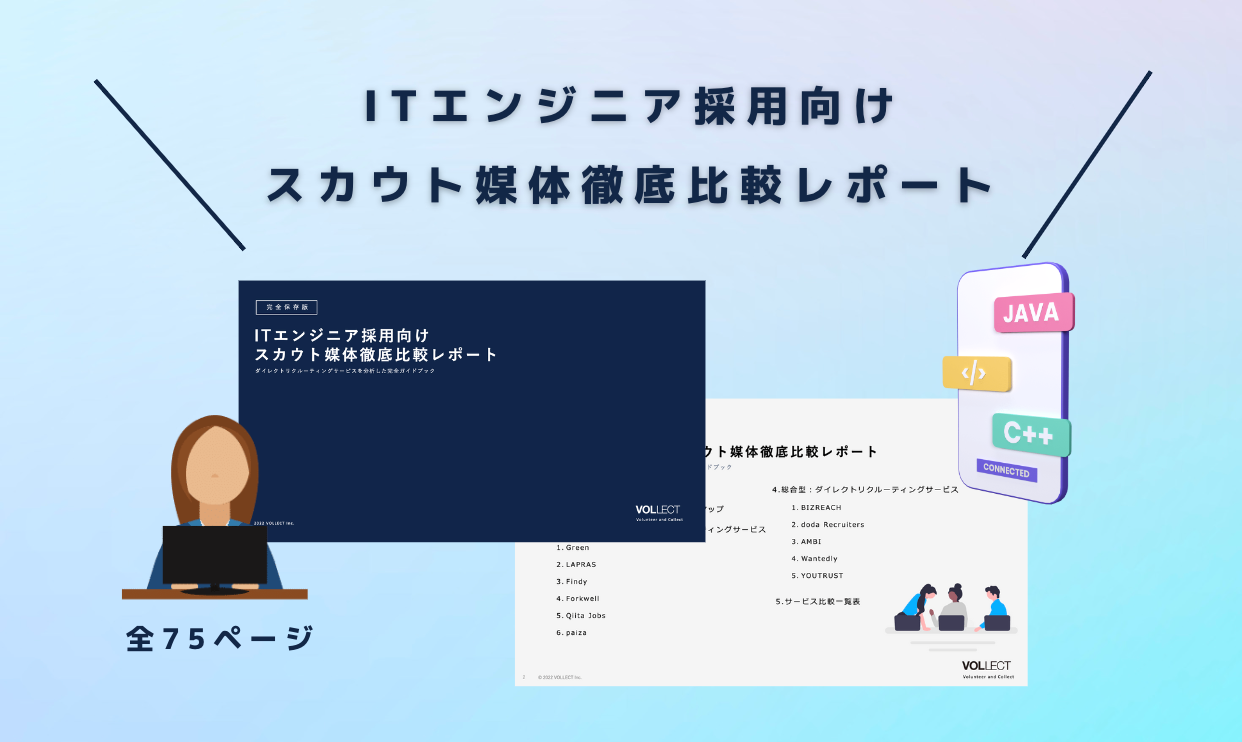 ダイレクトリクルーティングの運用支援サービスの提供を行う株式会社VOLLECT(本社:東京都渋谷区、代表取締役:中島大志 以下 「当社」)は、「ITエンジニア採用向け スカウト媒体徹底比較レポート」を公開いたしました。全75ページのホワイトペーパーは、無料でダウンロード可能です。