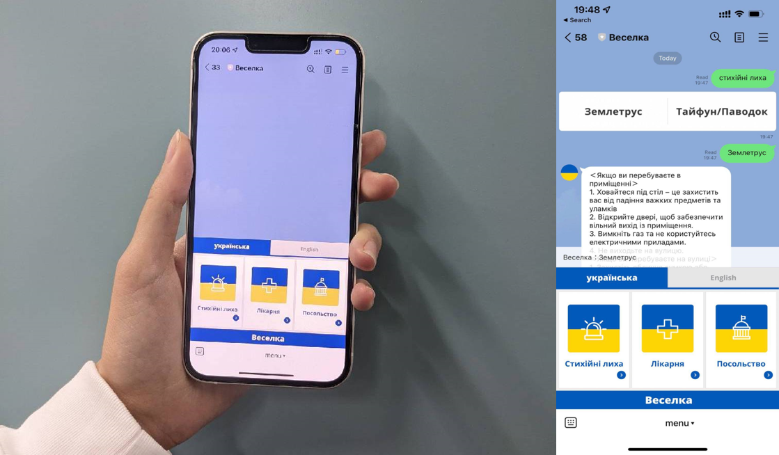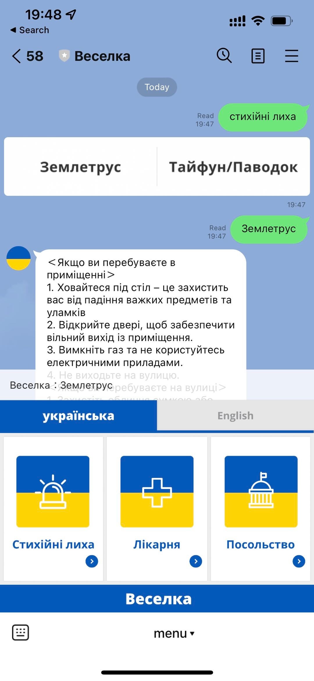 | ウクライナ避難民向け災害時アシストツールについて 名称:ベセルカ(ウクライナ語で「虹」) 対応SNS:LINE、Facebookメッセンジャー 開発期間:4週間 LINEやFacebookメッセンジャーでQRコードを読み込むだけでチャットボットで災害時・緊急時に取るべき行動がわかるというものです。地域ごとの最新情報を得る必要がある災害時においては、信頼できる情報にリンクしてアシストします。 |