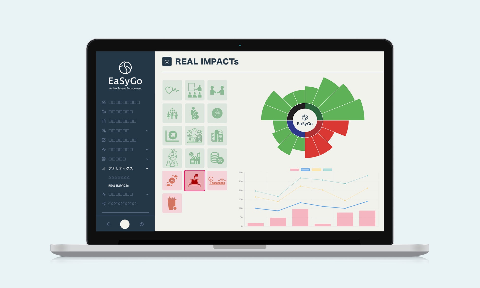 「EaSyGo REAL IMPACTs」は不動産から派生するあらゆるステークホルダーや社会へ与える多様なインパクト(環境的、経済的、社会的など)を算出し掛け合わせることにより、実質的なインパクトを定量化し、不動産へのESG・インパクト投融資における評価および改善へ活用するためのツールです。