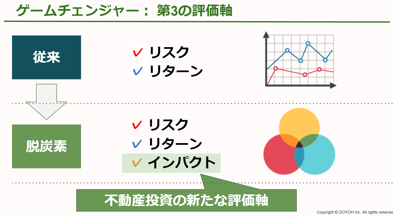 GOYOHは、ポジティブ・インパクト金融原則との整合性を持った、(1)不動産資産クラス独自で、(2)世界中のどの不動産でも適用できる、(3)EaSyGoの活用により新たに取得できるインパクト関連データ、の3要素を統合し、グローバルなESGリーダーからの支援と支持をうけて、この度のサービス開発へ至りました。