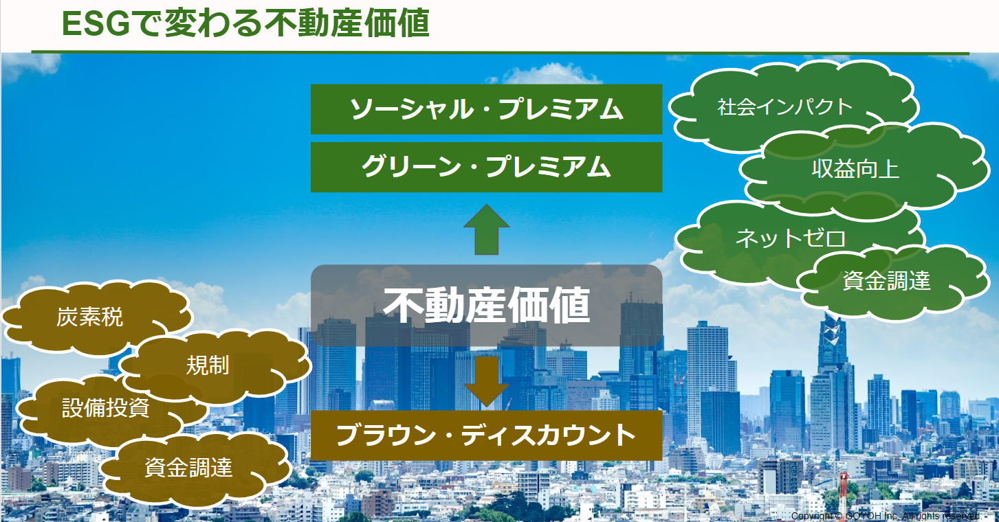 欧州をはじめとした不動産市場では環境的・社会的価値を基準とした資産価値への影響が顕在化し始めており、不動産資産の収益性、流動性、資本コスト、設備投資や規制対応コストなどに影響し、資産価値におけるプレミアムやディスカウント要素として、環境的・社会的価値は不動産の投資運用における重要項目となっています。