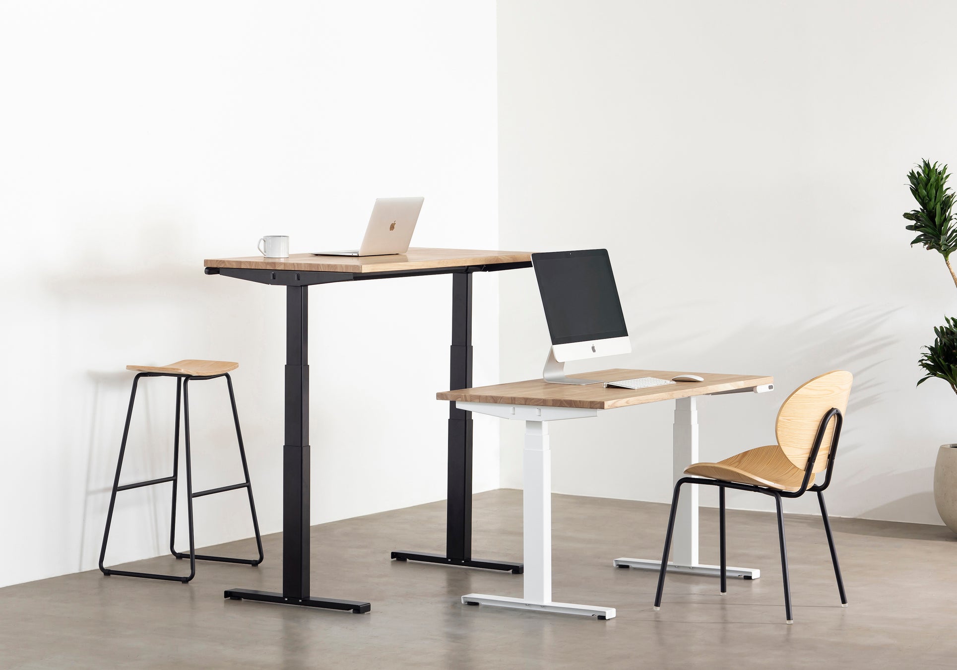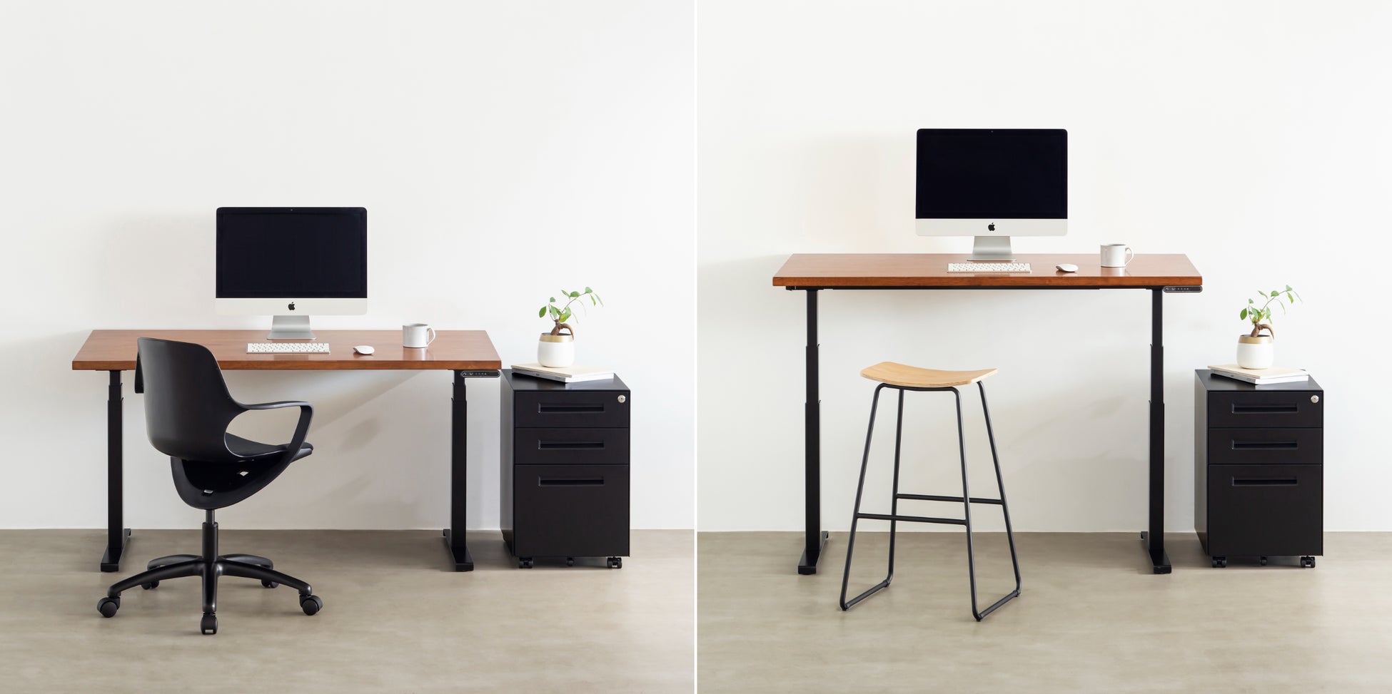テーブル脚は定番のブラックとホワイトの2色展開で、モーターなどを電動昇降脚の内部に備えて圧迫感のないすっきりとしたデザインとなっています。