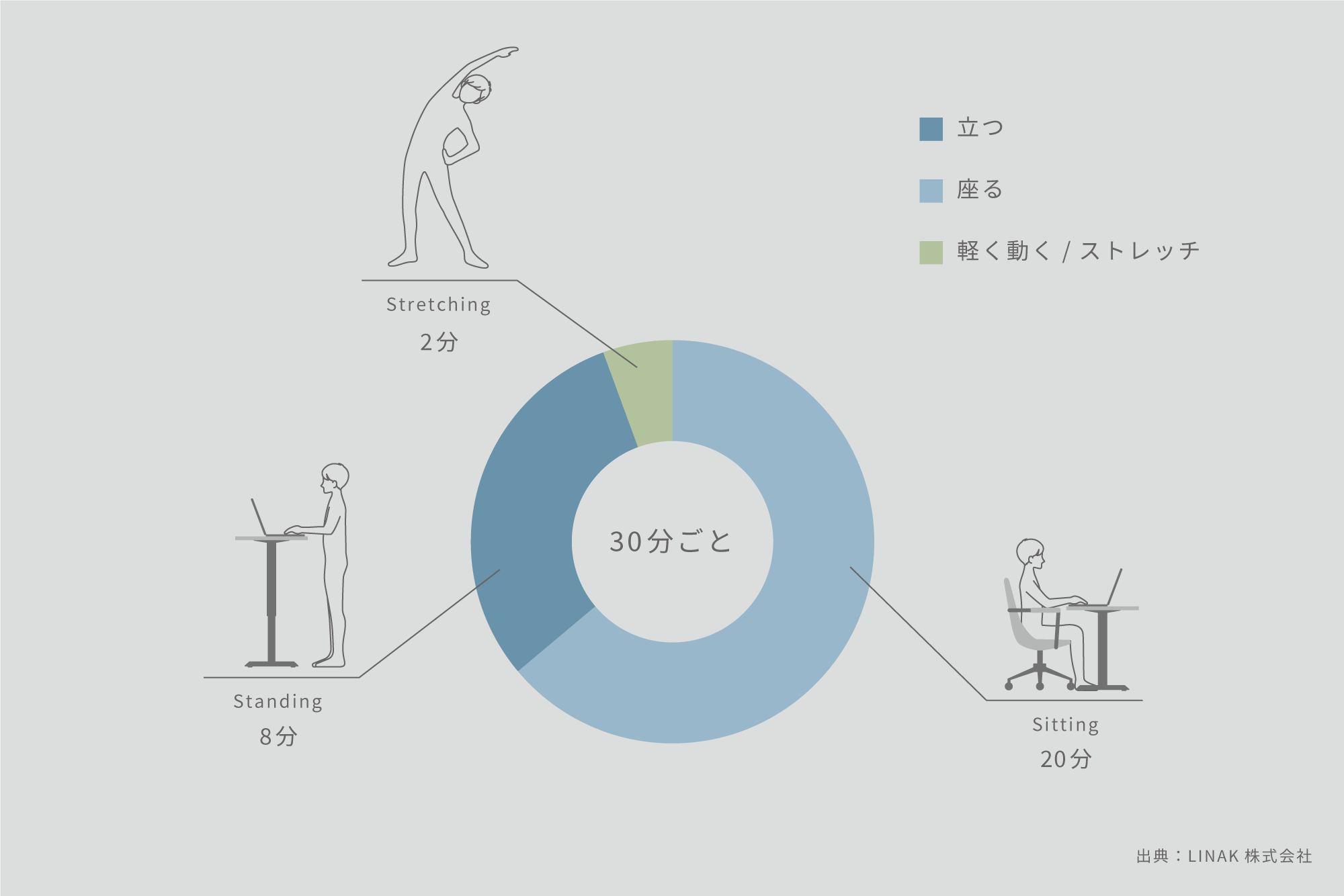 日本人は、1日のうちに座っている時間が世界一長いと言われています。 食事や移動など日常生活の中で座りながら行うことは沢山ありますが、大きく占めるのは長時間労働です。