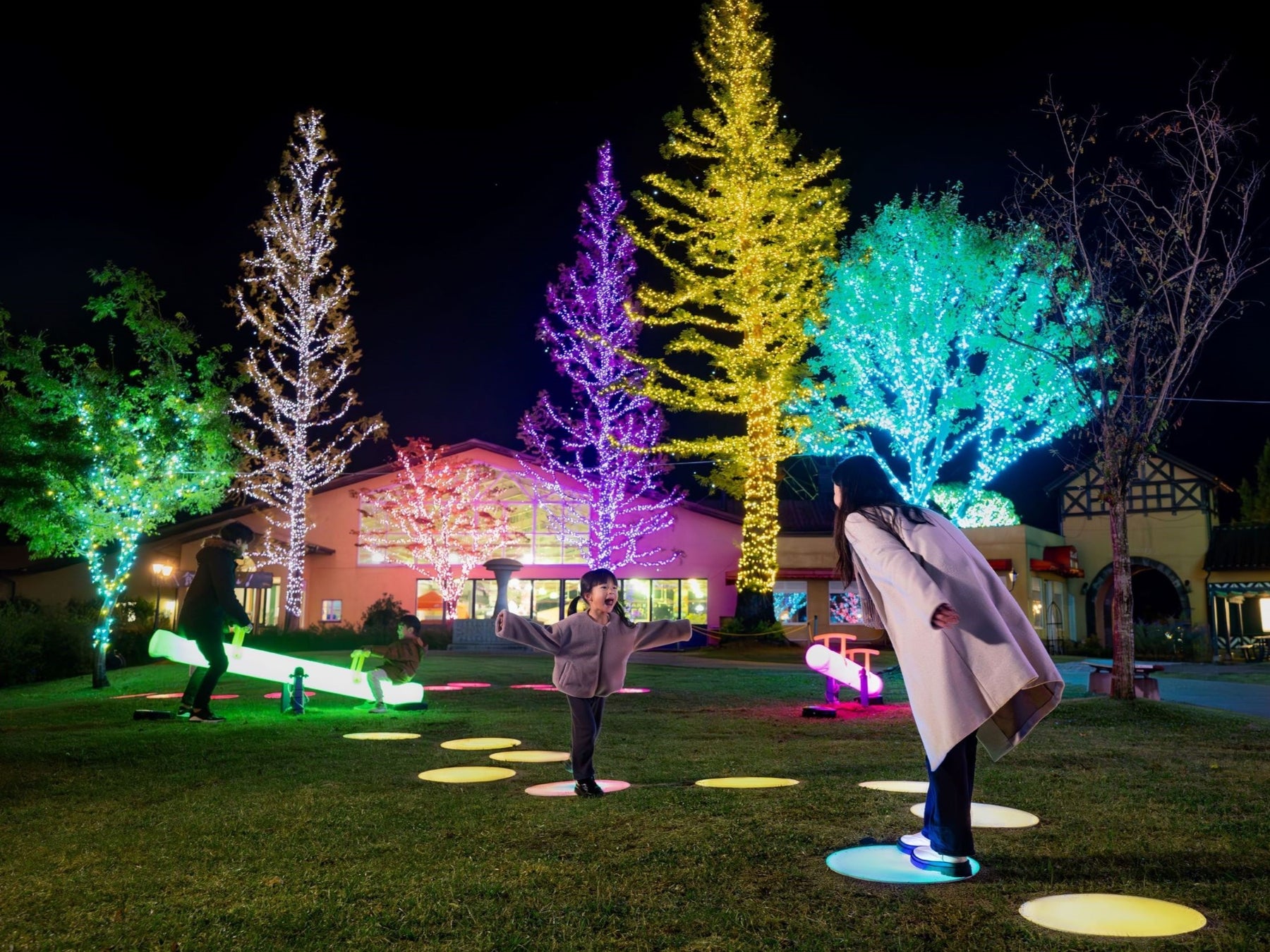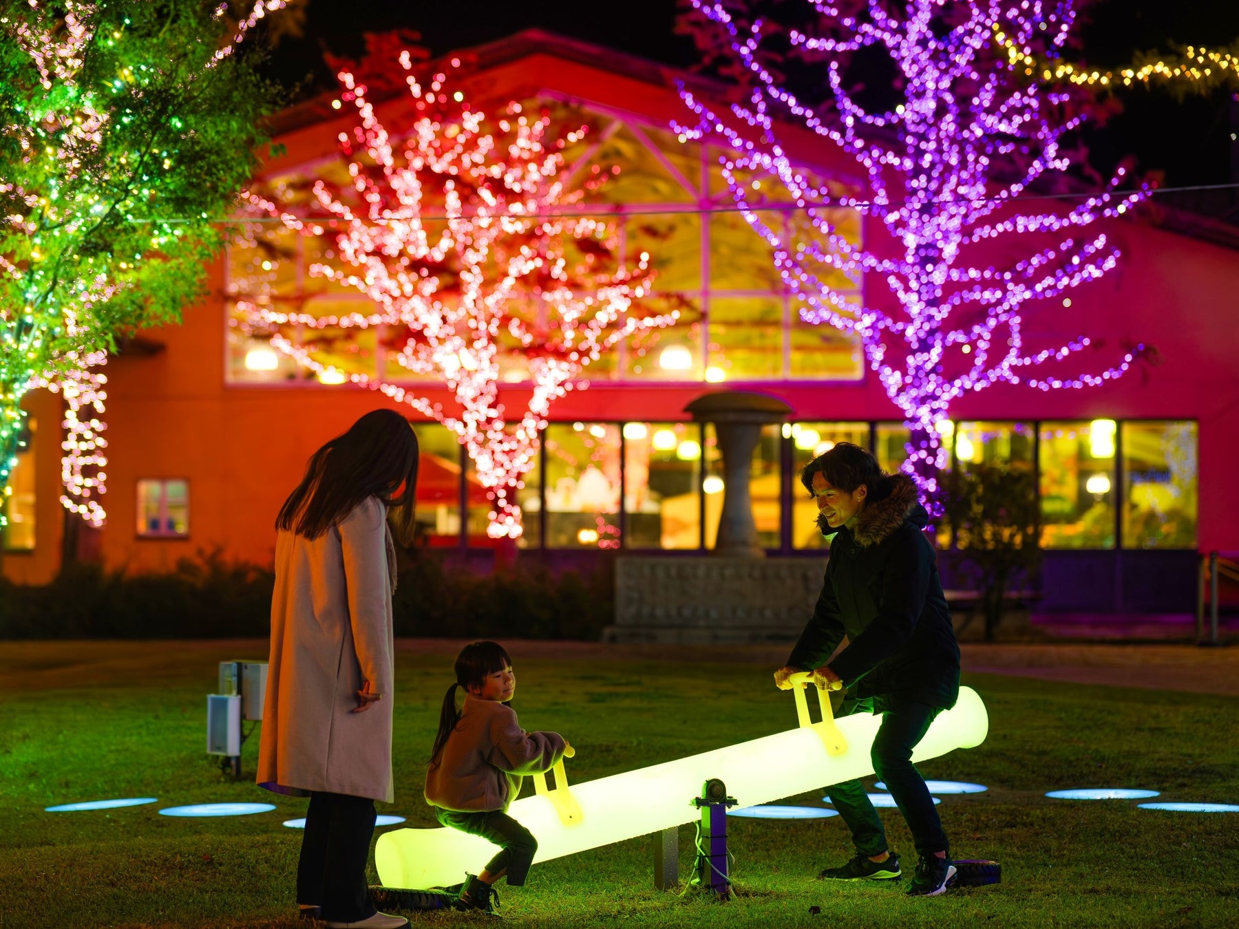 20m級のセコイアの木々を利用したツリーや、光るシーソー・音の鳴る光の道・動く動物ロボットのライトアップなど、大人から子どもまで楽しめるイルミネーションイベント
