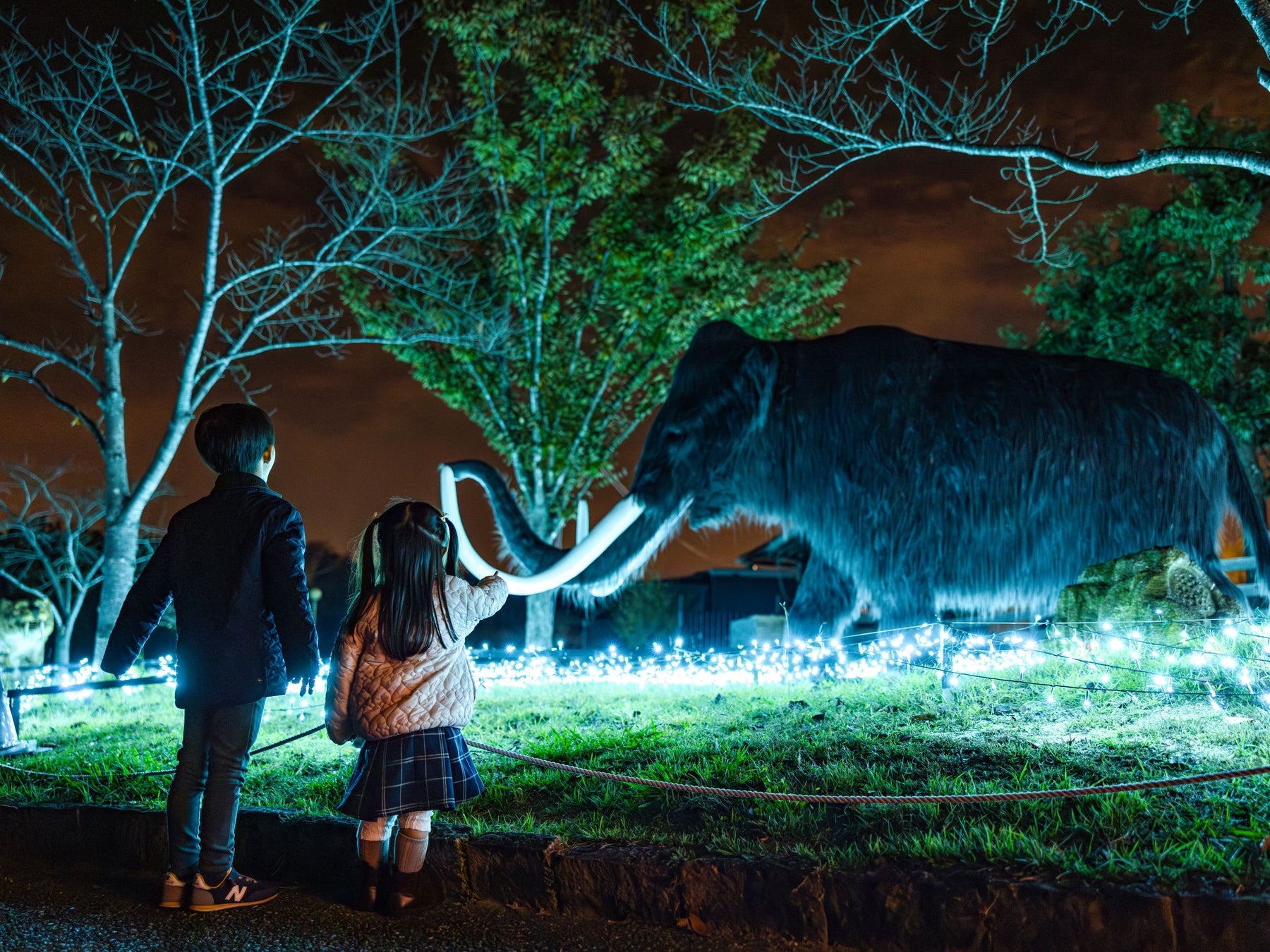 ライトアップされたマンモスやサーベルタイガーロボットは、リアルな造形や動いたり鳴いたりの演出で、大人も子どもも思わず足を止めてしまうぐらいの迫力です。