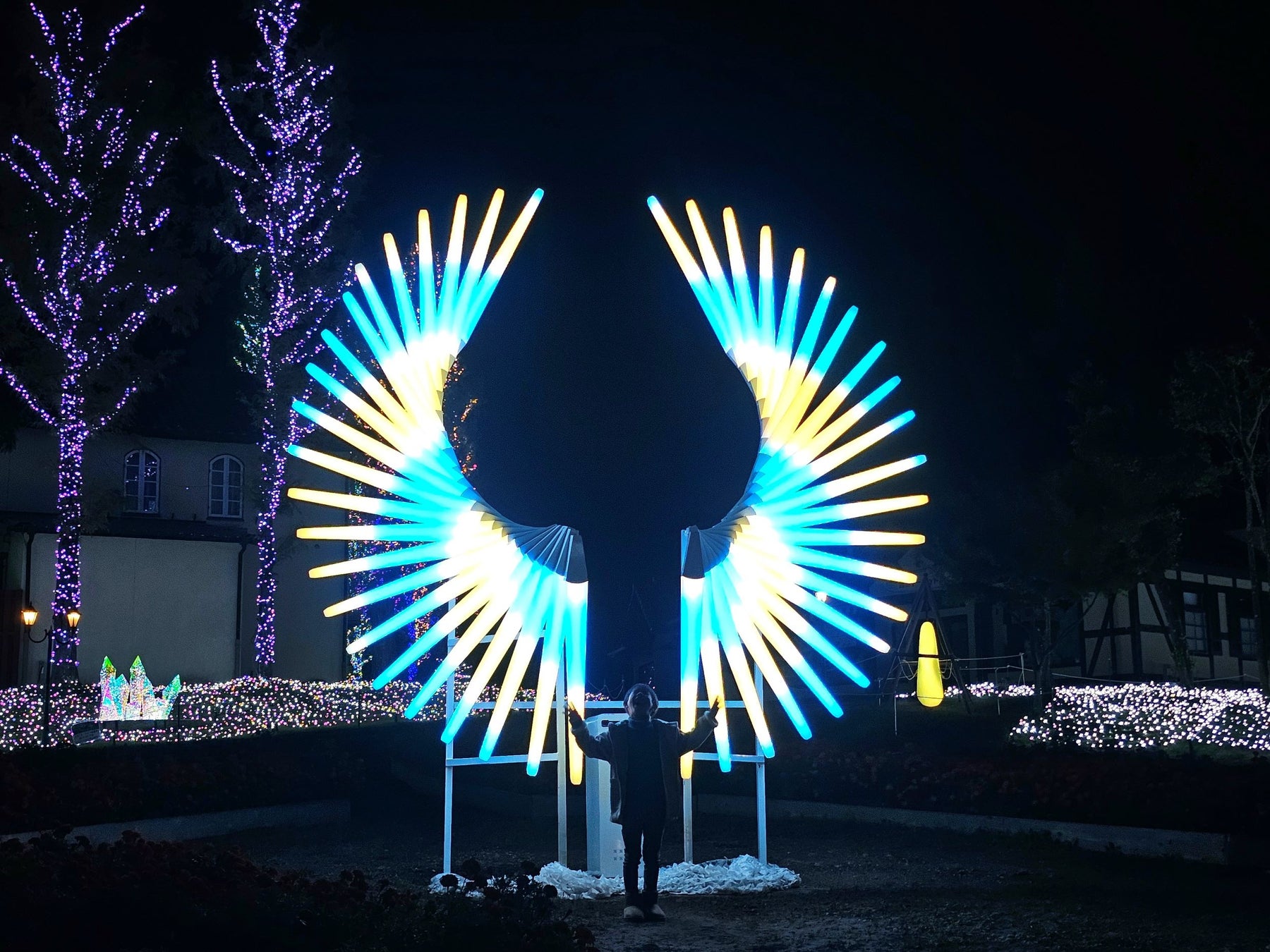 また、入園ゲートをくぐってすぐ目に入る輝くトナカイやカラフルに光る巨大な翼もお子様に人気です。光る翼は白色、赤色、青色、紫色など様々な色に次々と変わり、まるで翼が命を持っているかのような躍動感を感じさせます。